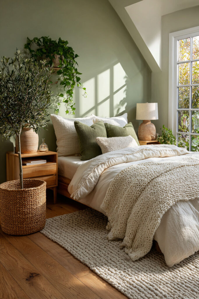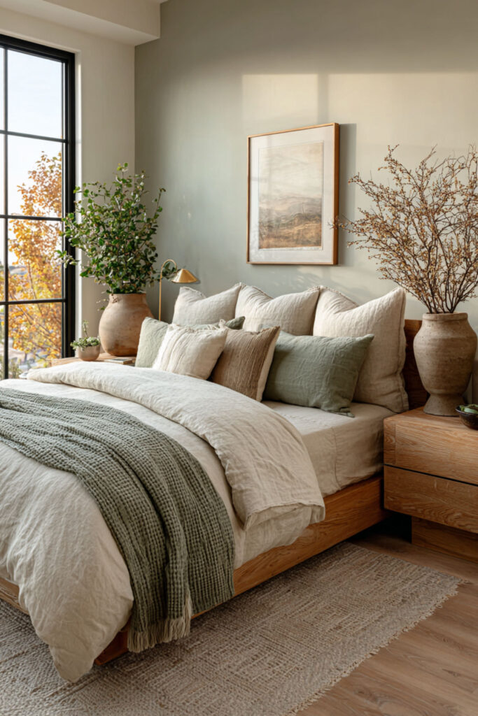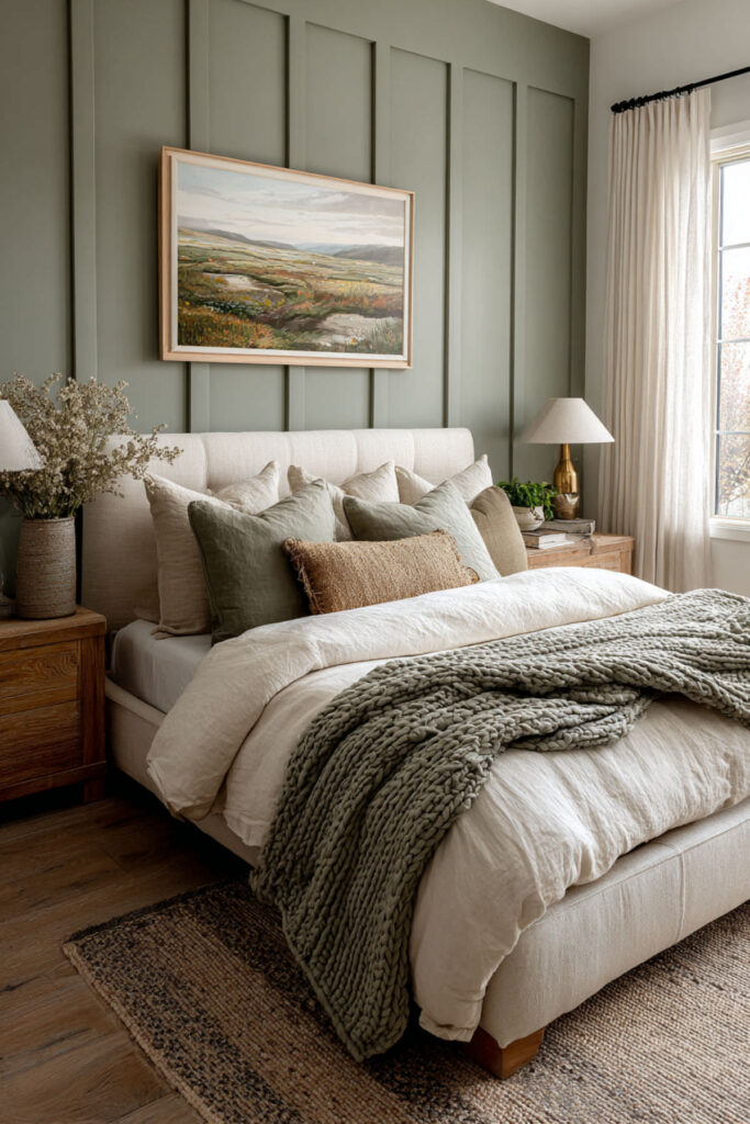 Sage green is the single most effective wall color for a shared bedroom because it calms without feeling cold and adds personality without being divisive. It’s nature-derived, gender-neutral, and pairs with every natural material in existence (wood, linen, stone, rattan, wool). Both partners look at sage green walls and feel the same thing: calm. That’s rare for a color with this much character. I strongly recommend sage green in a matte or flat finish on all four walls — the matte surface absorbs light and reduces glare, which makes the room quieter at night. Pair with cream bedding, warm wood furniture, and soft white trim. This sage green bedroom and sage wall bedroom idea is the foundation that makes every other natural element in the room work harder.