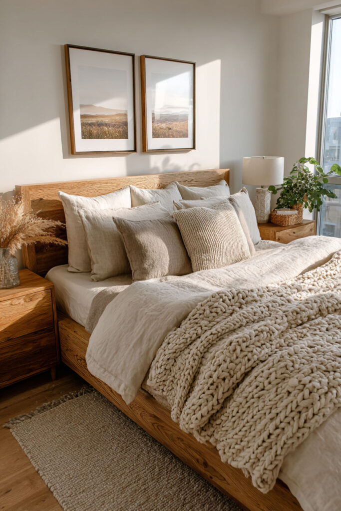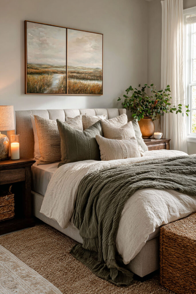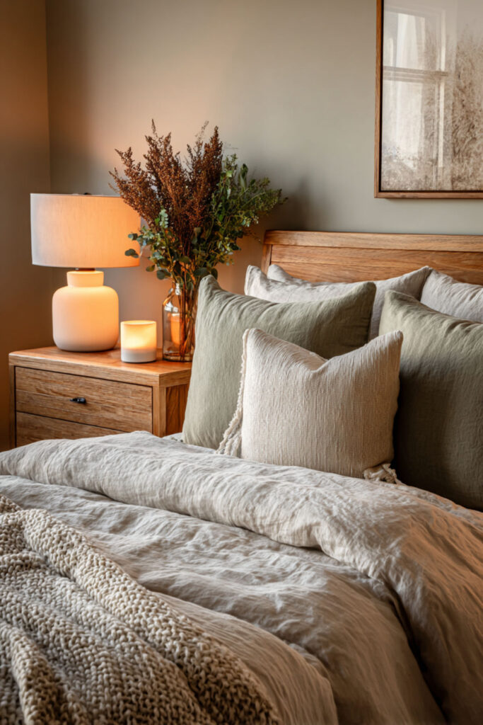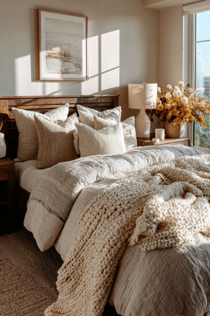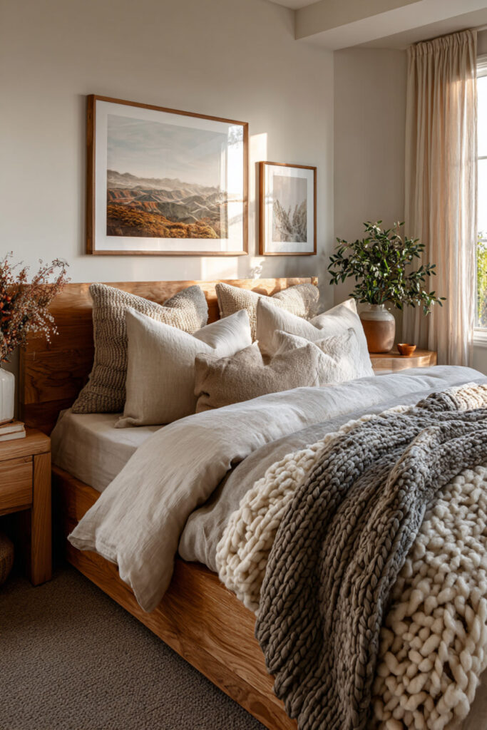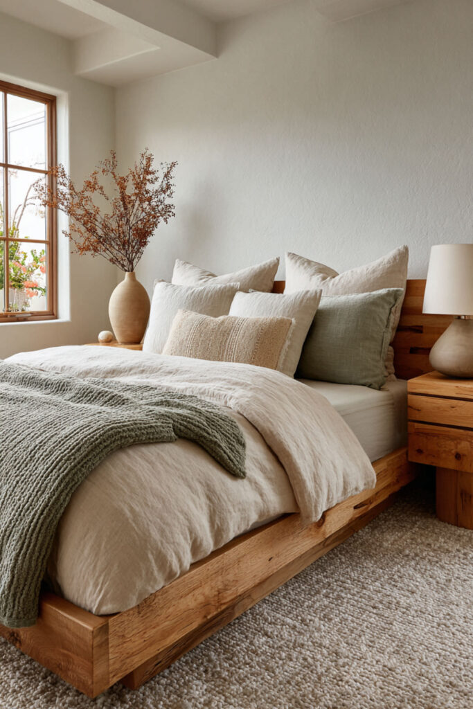 Linen bedding — real linen, made from flax — is the natural bedroom’s most important textile. It’s temperature-regulating (cool in summer, warm in winter), which matters enormously in a shared bed where two bodies generate different amounts of heat. It softens with every wash, it looks beautifully rumpled without being messy, and its natural color (undyed flax, soft cream, warm grey) sets the tonal foundation for the entire bed. I recommend linen sheets and a linen duvet cover in a natural or cream tone as the base layer, with a contrasting throw blanket in a warmer earth tone (terracotta, moss, warm brown) at the foot. This styled bed and bedding style idea creates a bed that looks inviting, feels incredible, and works for both sleepers.