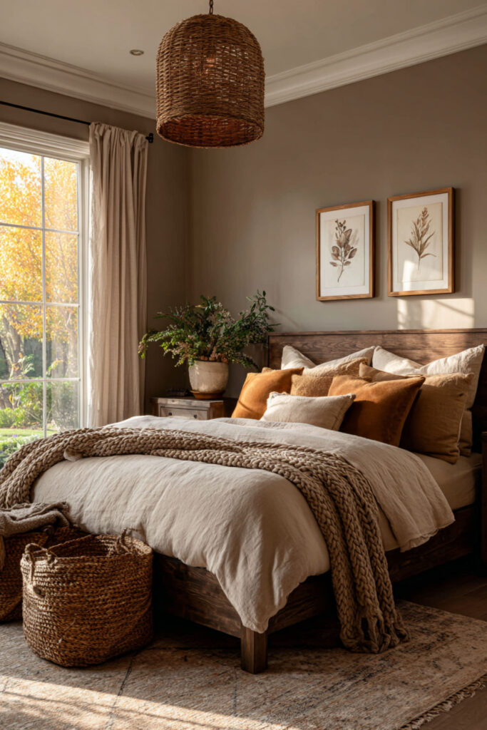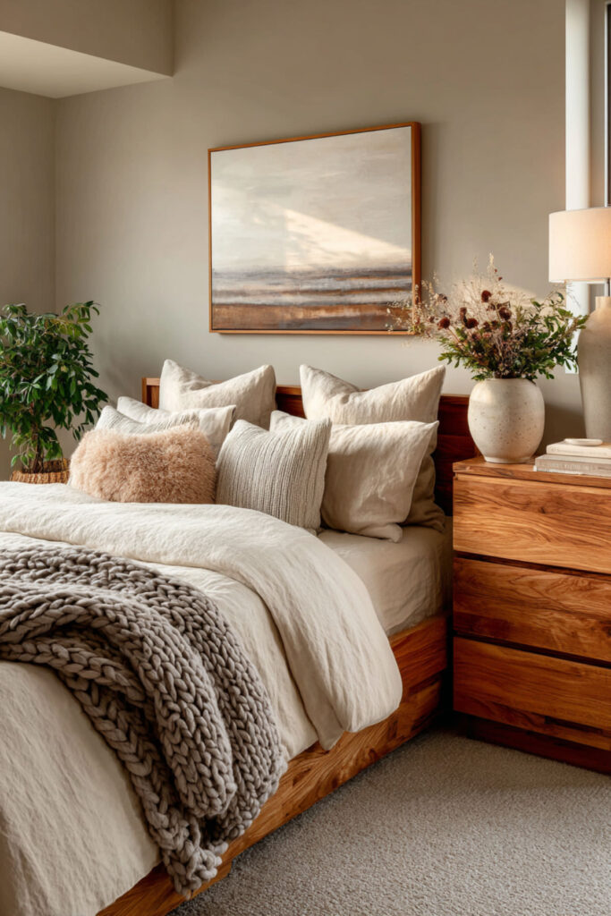 A natural fiber rug — jute, sisal, seagrass, or wool — placed beside the bed or under the foot of the bed adds a layer of warmth and texture that bare floors or synthetic rugs can’t match. The weave pattern adds visual interest without competing with other design elements, and the natural material keeps the room’s palette organic and consistent. I recommend a jute or wool rug in a neutral tone large enough to extend at least two feet on each side of the bed — when you step out of bed in the morning, your feet should land on something warm and soft, not cold floor. This earthy bedroom aesthetic and natural tones idea adds the tactile comfort layer that makes the room feel complete.