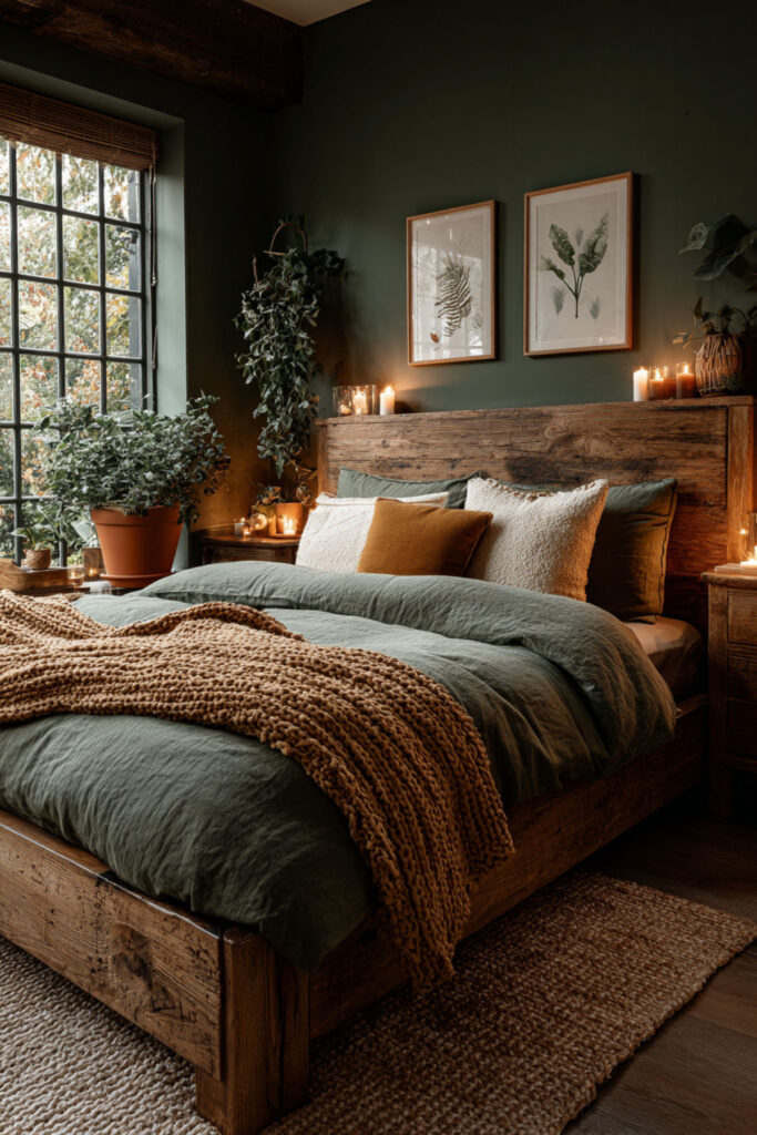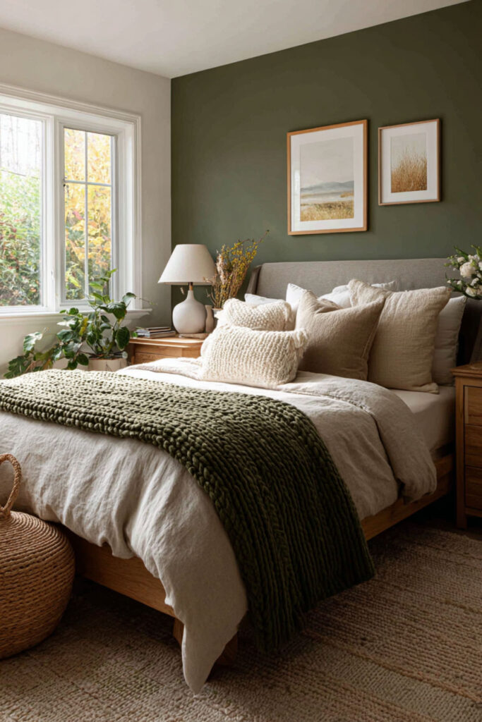 If sage green feels too soft and you want more visual depth behind the bed, olive green — a warmer, deeper green with brown undertones — creates a nature-inspired accent wall that feels both grounding and sophisticated. Olive is the color of mature forest canopy, of evening light through leaves, and it pairs beautifully with natural wood, cream linen, and warm metallics like brass. I recommend olive green on a single accent wall behind the bed in a matte finish, with the remaining walls in a warm cream or soft beige. This olive green bed room and accent wall olive green idea adds character and depth to a shared bedroom without overwhelming either partner’s visual comfort.