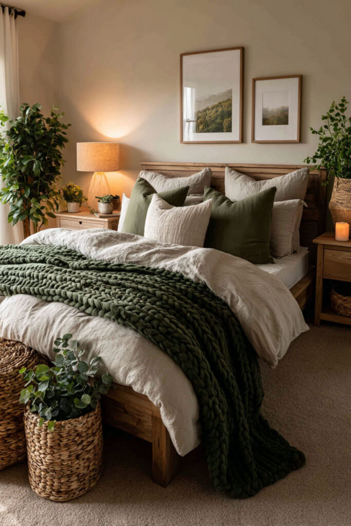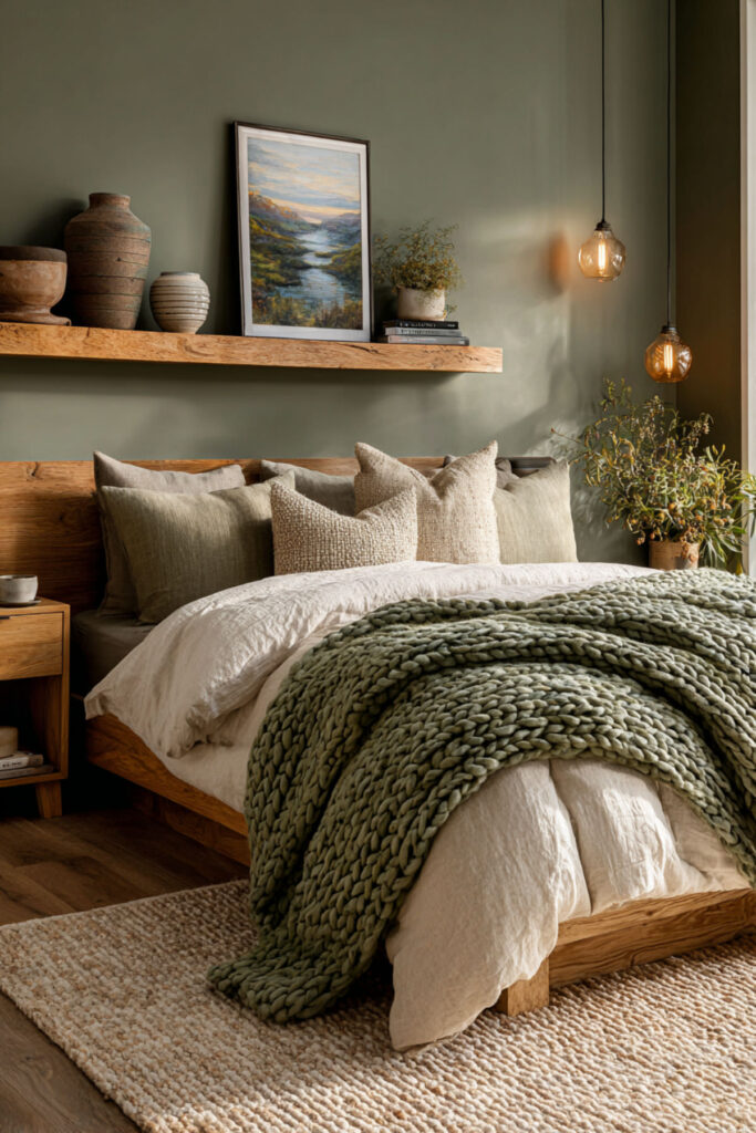 An earthy bedroom and organic modern bedroom in the green family blend natural materials with clean, contemporary lines. I recommend warm oak furniture, a low-profile linen bed, matte ceramic lamps, and sage or olive green on the walls for a room that feels modern but warm. Cozy earthy bedroom and cozy neutral bedroom approaches that include green as the grounding color create rooms that are both minimal and emotionally rich. Subtle texture bedroom details — a nubby linen throw, a handwoven rug, a ceramic vase with dried eucalyptus — bring tactile warmth that a screen can’t replicate.