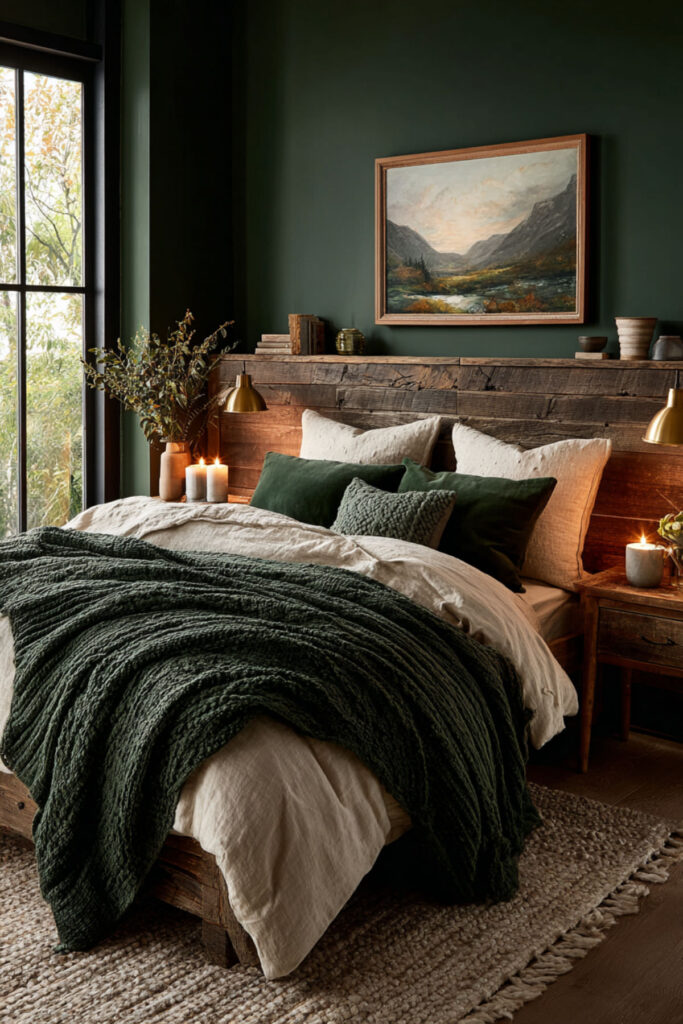 A cozy rustic bedroom and cozy farmhouse bedroom ideas in the green family bring countryside warmth — white trim, distressed wood, warm metals, and soft natural textiles — into a green palette. I recommend sage green shiplap or board-and-batten on an accent wall with warm wood furniture and cream linen bedding for a farmhouse green bedroom. Cozy cottage bedroom and cozy country bedroom approaches that include green feel grounded and personal. Forest green bedrooms and moss green bedroom walls in the rustic family bring deeper drama to the countryside look.