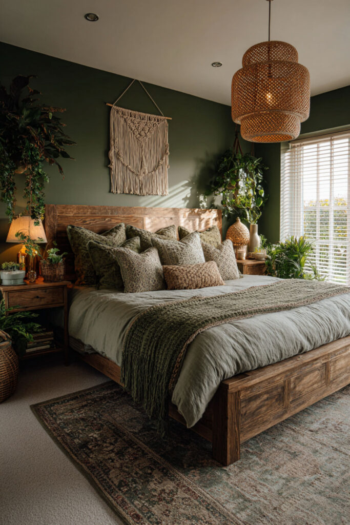 Cozy Boho and Eclectic Green Bedroom: Personal and Warm