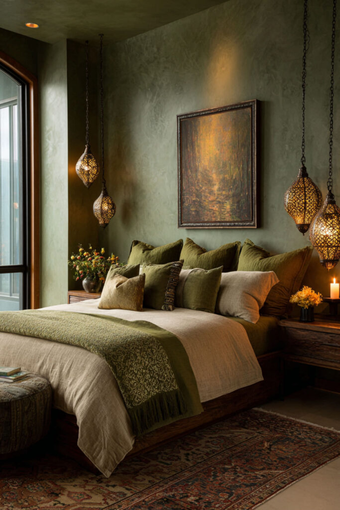 Cozy boho bedroom ideas in the green family bring pattern, texture, and collected personality into the room. I recommend vintage textiles, macramé, warm wood, woven baskets, and layered rugs against sage or olive green walls for a room that feels lived-in and loved. Cozy eclectic bedroom approaches that mix green with warm metals, colorful textiles, and personal objects create bedrooms that tell a story. Bedroom ideas in green and bedroom ideas with green and bedroom ideas decor approaches in the boho family feel warm and inviting. Decor inspiration bedroom looks that layer pattern over green walls feel organic rather than designed.