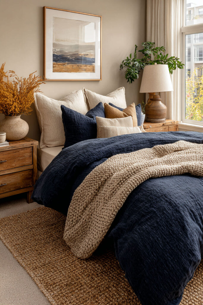 Layered bedding — a cream duvet, a navy throw at the foot, beige or tan accent pillows, maybe a cream knit blanket folded over the side — creates the tonal richness that makes a bed look genuinely luxurious without being fussy. The layers serve a practical purpose too: different weights and textures let both partners adjust their warmth throughout the night and morning without one person’s comfort dictating the other’s. Navy, cream, and warm beige together create a palette that feels like a high-end hotel suite — except this one is yours, and nobody is checking out at 11 a.m. I recommend a cream duvet cover, one navy throw blanket at the foot, two cream euro shams, and two to three accent pillows in a mix of navy, warm beige, and cream. This navy blue and beige bedding and beige and navy bedroom idea builds the bed into a layered, inviting landscape that two people can arrange however they want.