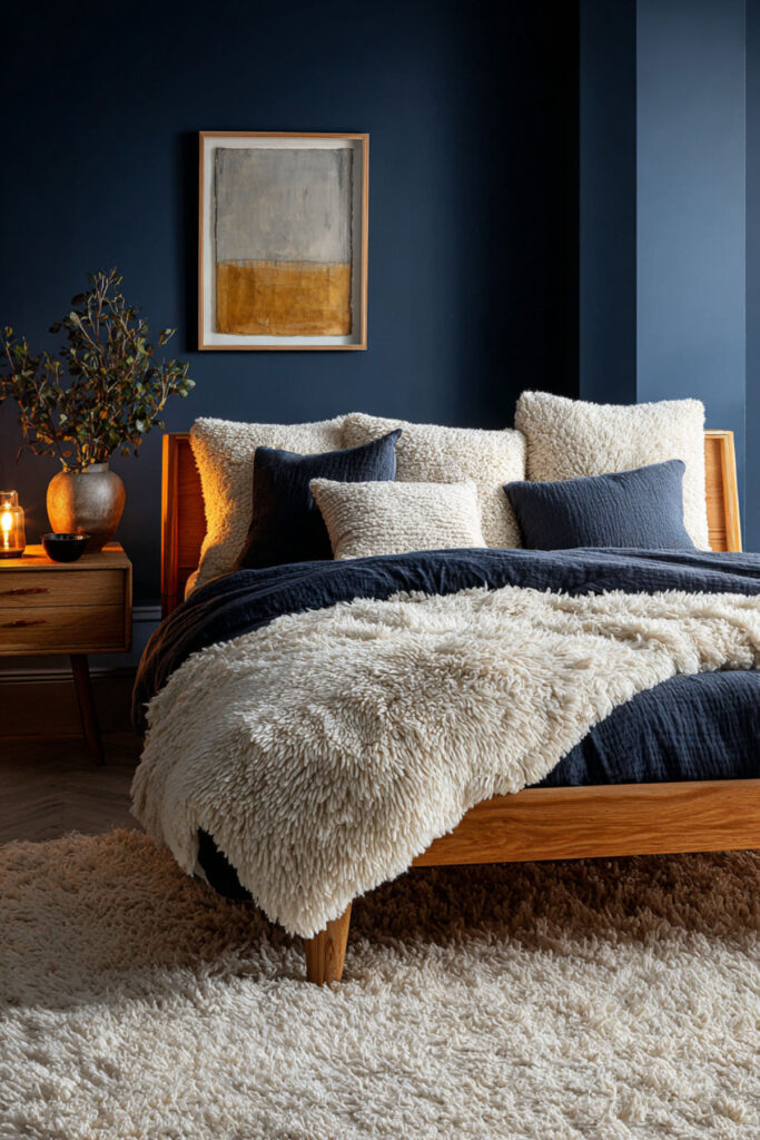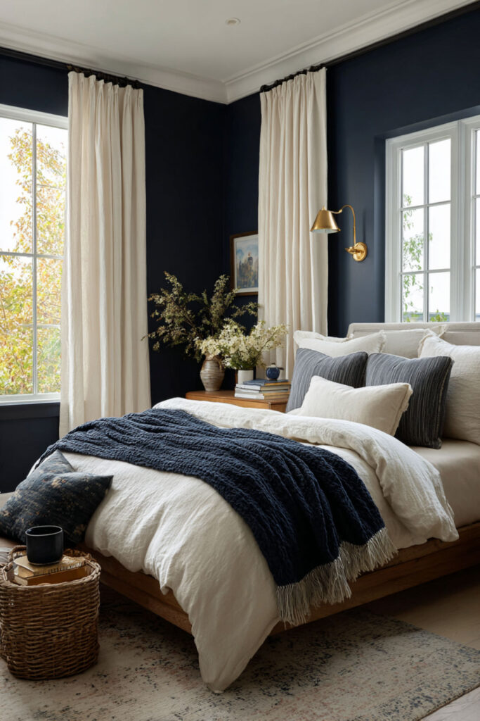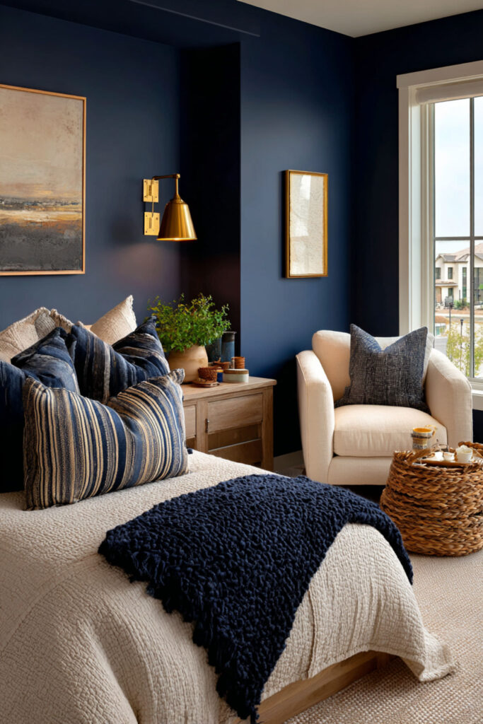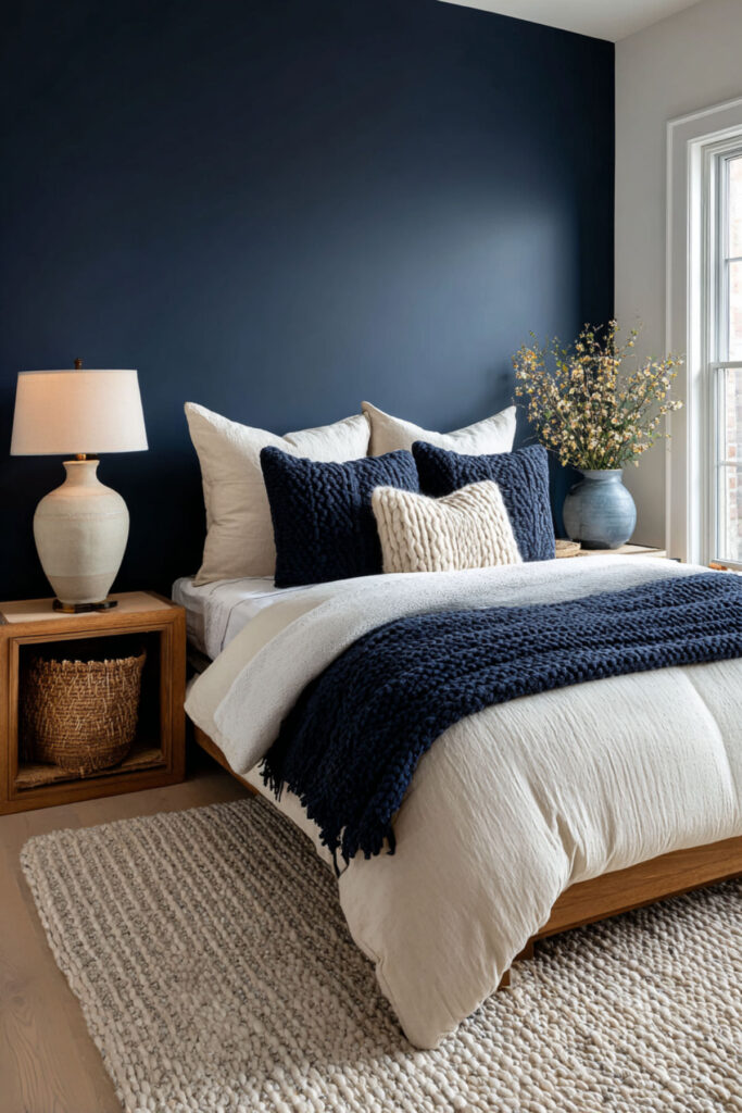 A single navy blue wall behind the bed establishes the room’s identity without committing all four walls to a dark color. The navy wall creates depth and drama exactly where the bed sits, which makes the bed feel like the room’s center of gravity — and in a slow-morning bedroom, the bed should feel like the most important place in the house. The remaining three walls in soft cream keep the room bright and airy, so morning light still fills the space while the navy wall adds that grounding richness behind you as you lie there with your coffee. I recommend navy blue in matte or eggshell finish on the wall behind the bed, with soft cream or warm white on the remaining three walls. This navy blue accent wall bedroom and one navy wall bedroom idea is the single most versatile version of this palette — dramatic enough to feel intentional, bright enough for morning light.