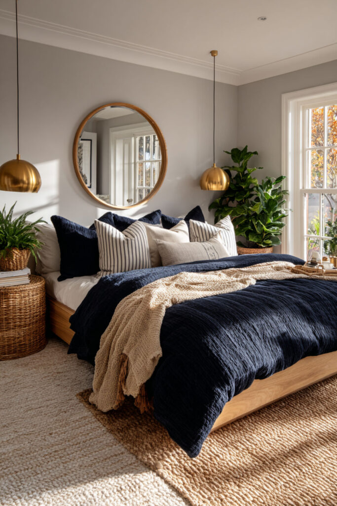 Create impact with a tall navy headboard against tan or white walls. This vertical element draws eyes up, making ceilings feel higher. I really recommend going dramatic with headboard height – it’s furniture as architecture.