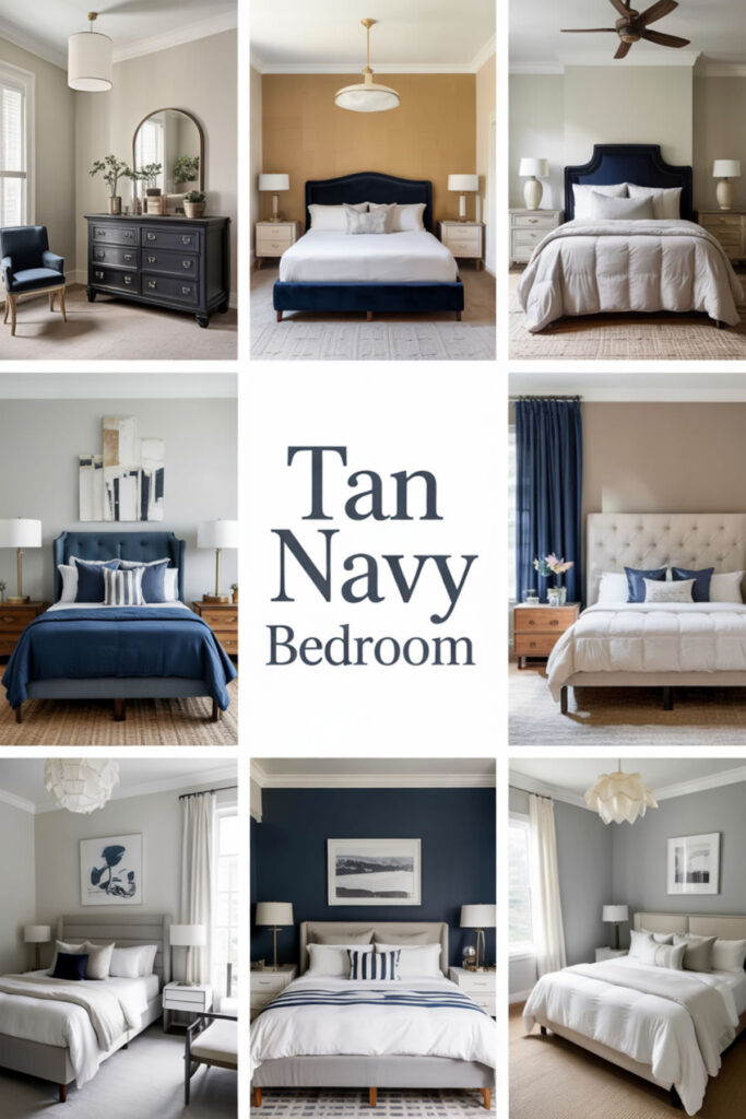 Start with the perfect ratio: navy as your anchor color (30-40%) and tan as your balancing neutral (60-70%). Use navy for statement pieces – an accent wall, upholstered headboard, or window treatments – while tan grounds the space through larger surfaces.