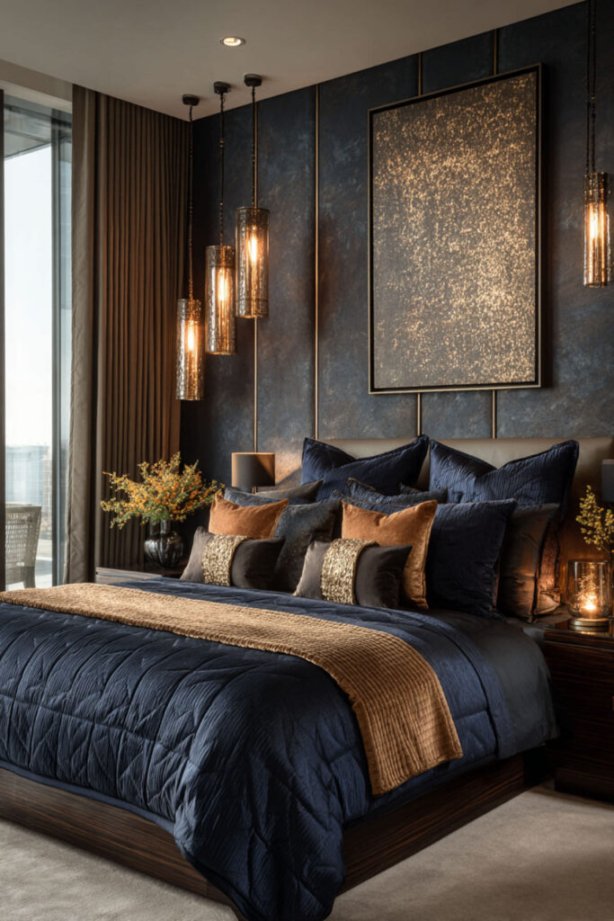 Invest in a navy upholstered bed as your room’s anchor. Whether tufted velvet or clean-lined linen, this statement piece justifies itself daily. This bold choice actually simplifies decorating – everything else can stay neutral.