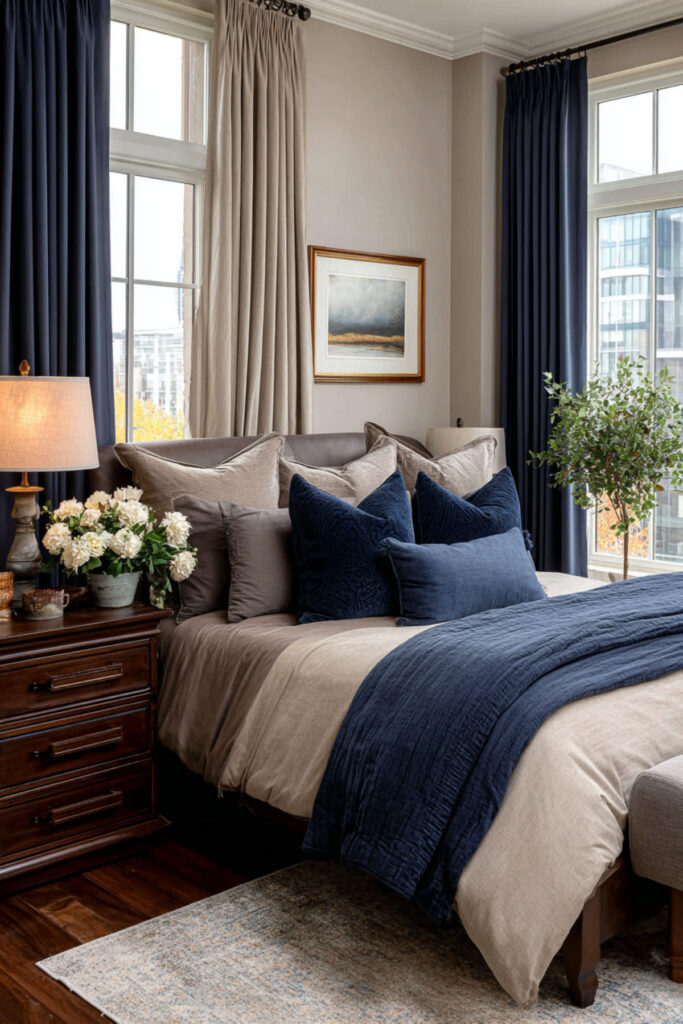 Reverse the formula with warm tan walls and navy furniture pieces. A navy velvet bench at the foot of the bed or navy upholstered chairs creates sophisticated punctuation.