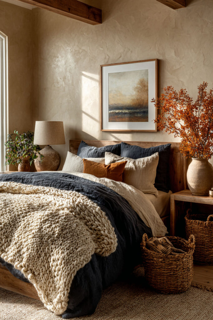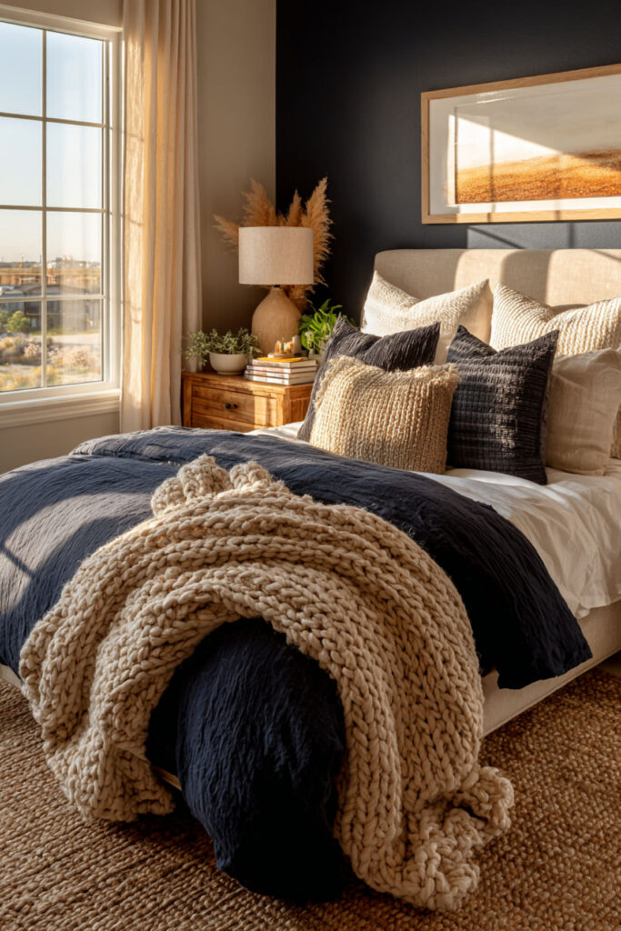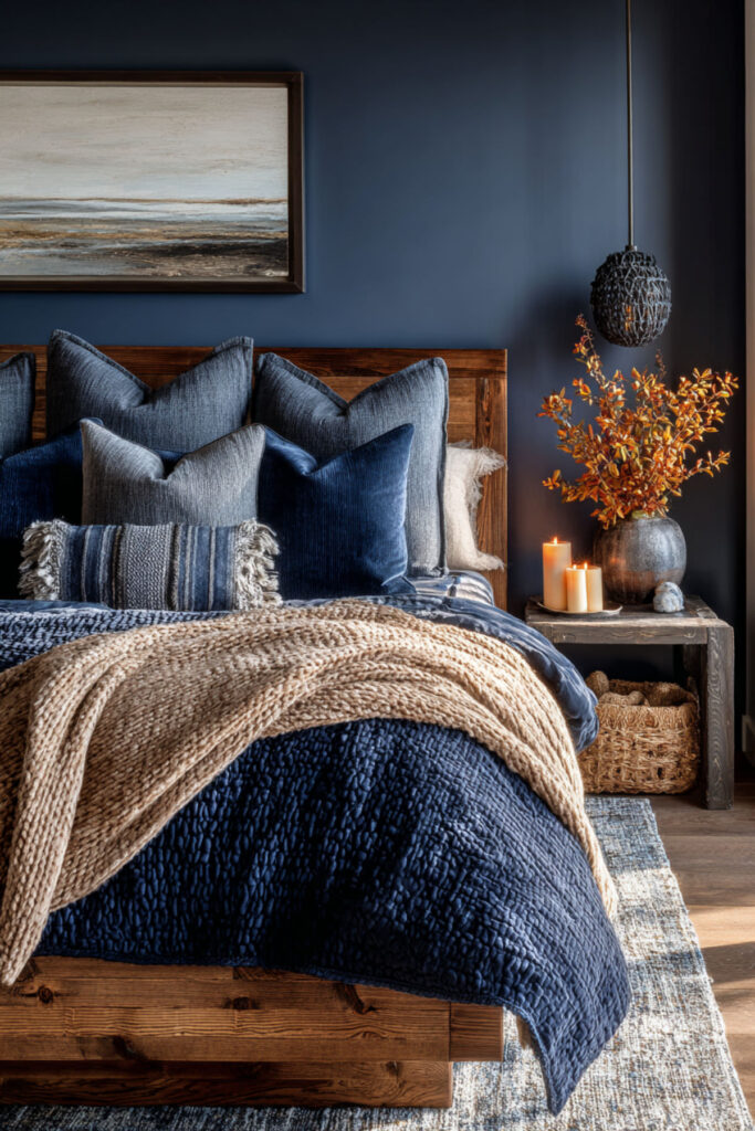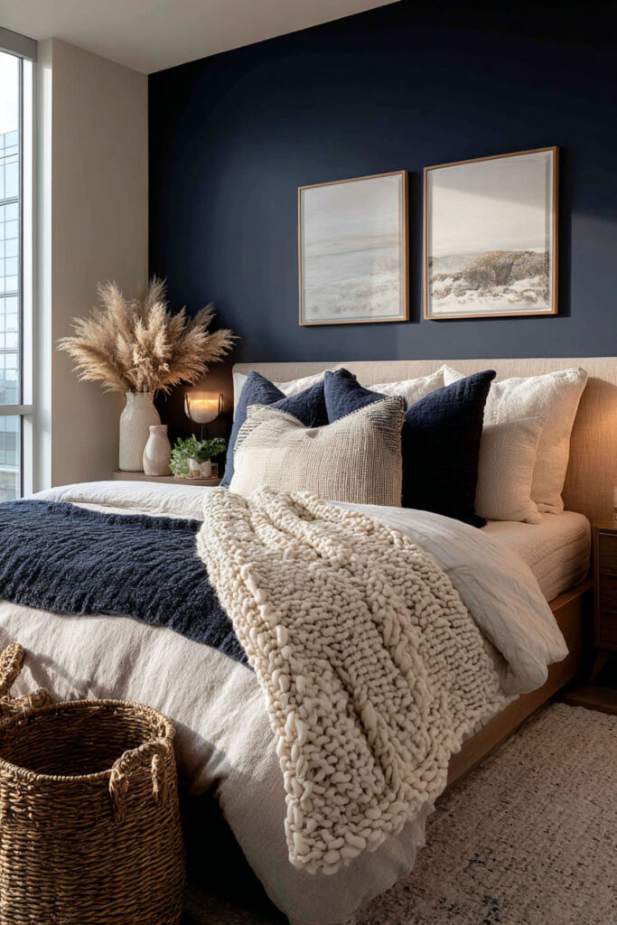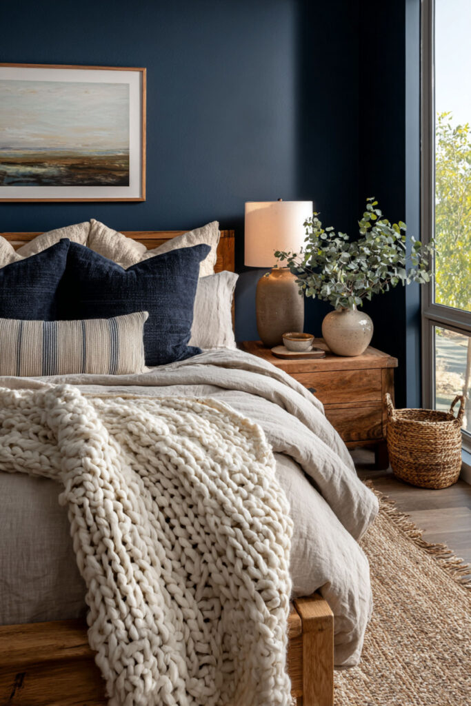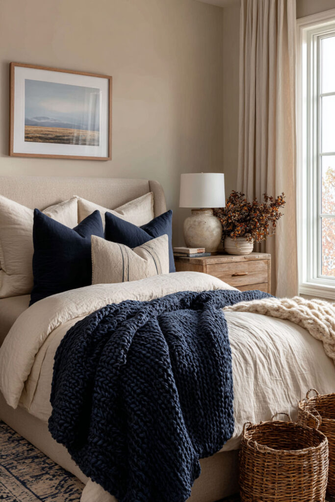 And here’s the best part — you can go all-in on the cozy factor without losing the elegance. A bedroom with tan walls, cream bedding, and navy accents woven throughout — a navy knit throw at the foot of the bed, navy taper candles on the dresser, a navy binding on a favorite book visible on the nightstand — creates this warm, layered feeling that’s equal parts put-together and lived-in. I strongly recommend a cable-knit navy throw blanket — it adds texture, color, and the kind of coziness that makes you want to crawl into bed an hour early. This cosy interior approach to a navy accents bedroom is about layering comfort into every surface and every sightline. An elegant reset retreat should look refined, yes — but it should also feel like the warmest room in your home.