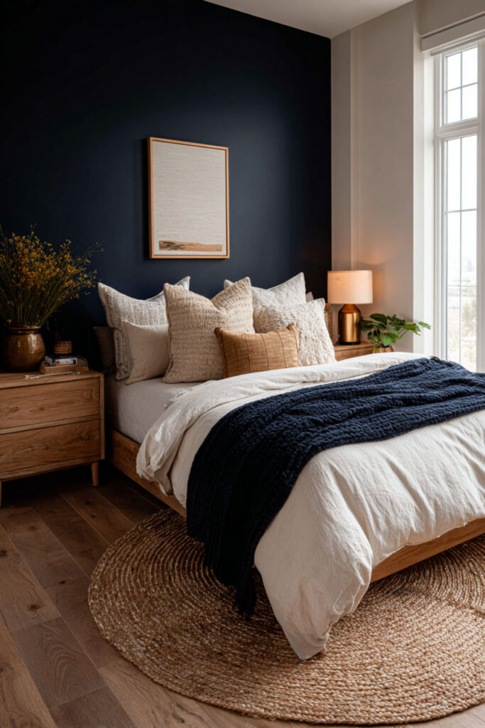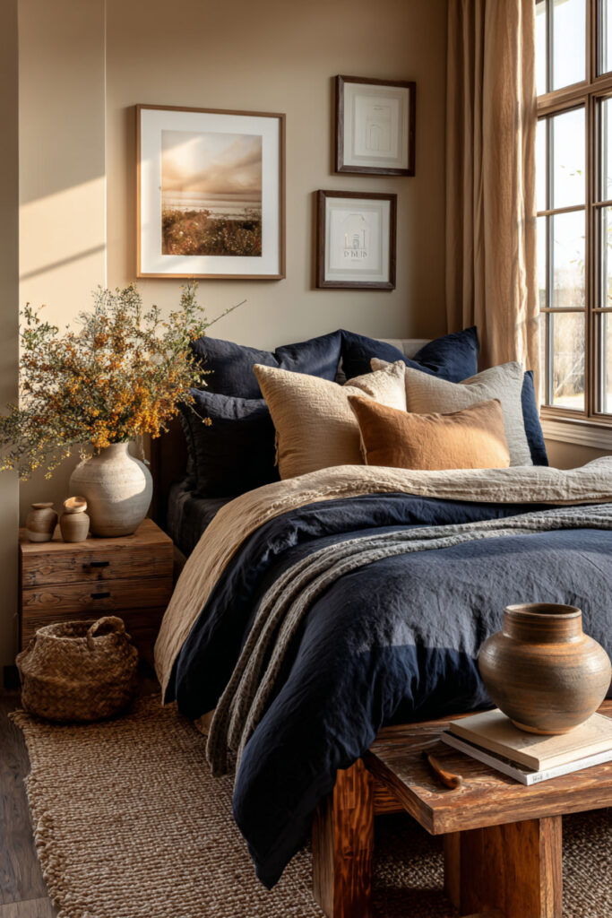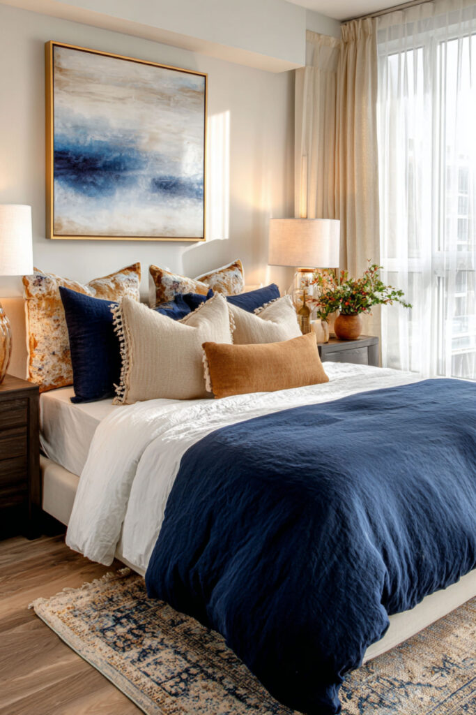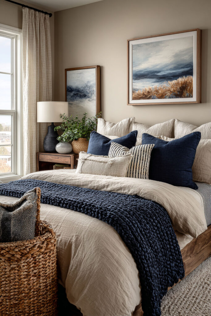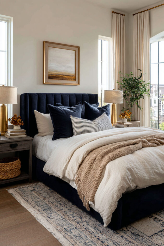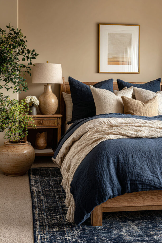 Not everyone wants a fully committed navy room — and that’s fine. A neutral bedroom with navy blue accents gives you the emotional benefits of the color without the commitment of painting four walls. Warm tan or beige walls, cream bedding, and then navy showing up through throw pillows, a blanket, a piece of art, or a ceramic vase. The navy becomes the thread that ties the room together without dominating. I recommend two to three navy accent pillows in different textures — velvet, linen, and a woven cotton — to add depth and keep the navy from looking flat. This neutral bedroom with blue accents approach is the most accessible idea on this list because it requires zero paint and zero furniture changes. Just a few strategic additions and the whole room shifts.