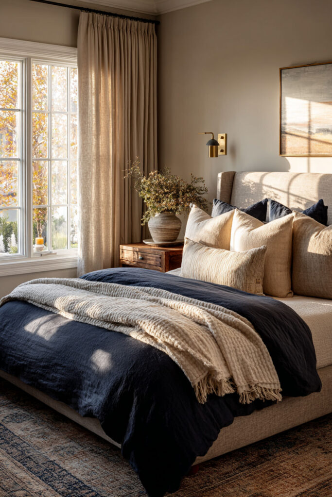 Taupe is tan’s quieter, cooler sister — and when you pair it with navy, the result is a bedroom that feels incredibly refined. A blue and taupe bedroom leans slightly more neutral, more muted, and more understated than a straight navy-and-tan room. Taupe curtains, a taupe rug, taupe-toned throw pillows against a navy duvet — everything reads as intentional and composed. Okay, I’ll admit I used to overlook taupe as boring. But I’ve completely changed my mind. In the right context, it’s one of the most sophisticated neutrals out there. I recommend a taupe linen curtain panel in a floor-length cut — it softens the window, complements the navy, and adds that elegant vertical line every room needs. This navy blue and taupe bedroom color scheme is for the woman who loves subtlety over statement.
