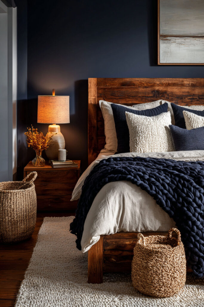 There’s something about dark wood against navy that just hits differently. A dark walnut or espresso-toned headboard in a navy-and-tan bedroom adds this rich, library-like quality — the kind of room you’d imagine in a beautifully restored brownstone in Boston. The dark wood gives the navy walls a complementary depth, while tan bedding softens everything so it doesn’t feel heavy. I strongly recommend a dark wood headboard with a simple panel design — nothing too ornate, just clean lines and beautiful grain. Let the wood speak for itself. This navy and tan bedroom with wood accents is ideal for women who want their retreat to feel established and collected, like a room that’s been refined over years rather than assembled in a weekend.