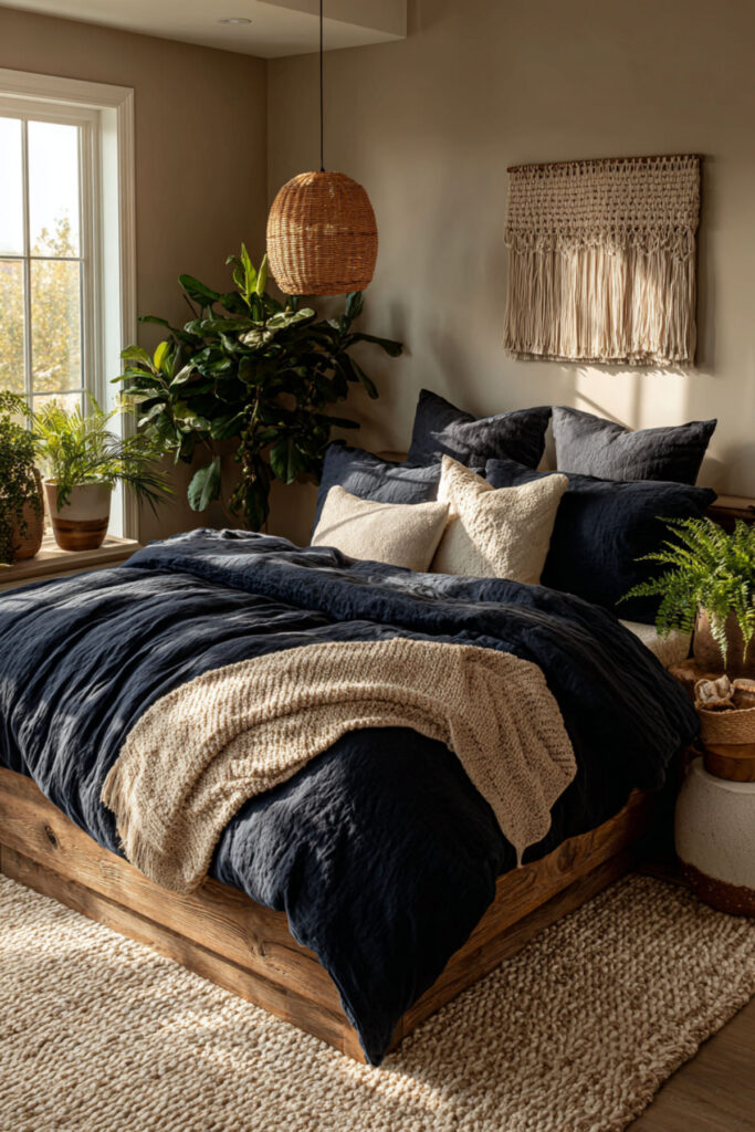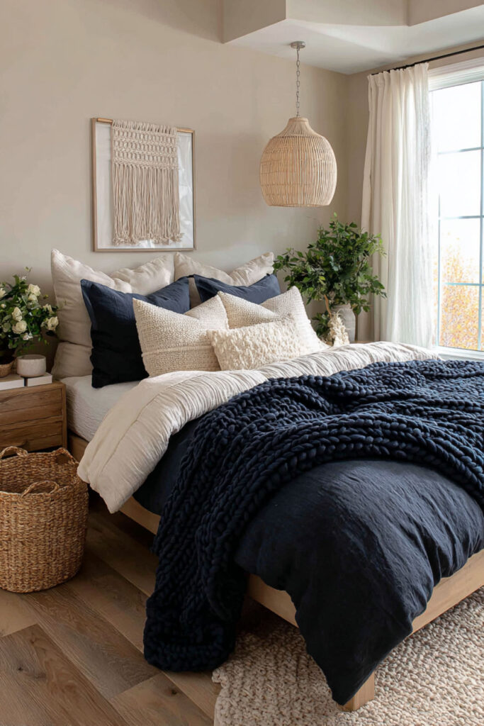 Navy Bedding with a Tan Woven Throw and Natural Textures