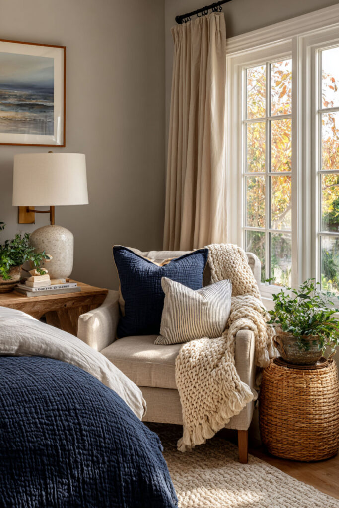 Every reset retreat deserves a spot that isn’t the bed — somewhere to sit with a cup of tea and a book, or just to stare out the window for ten minutes without checking your phone. A small upholstered chair in tan or cream, angled next to a window or a floor lamp, with a navy throw draped over the arm, creates a secondary zone in the bedroom that signals “this is time for me.” I recommend an armless slipper chair in a warm linen — it has a small footprint but it looks intentional, and it gives you a place to decompress that isn’t horizontal. This navy and tan master bedroom idea is about building a space with purpose beyond sleep. Would you try it? I think every woman who designs a reset retreat ends up saying this corner became her favorite part.