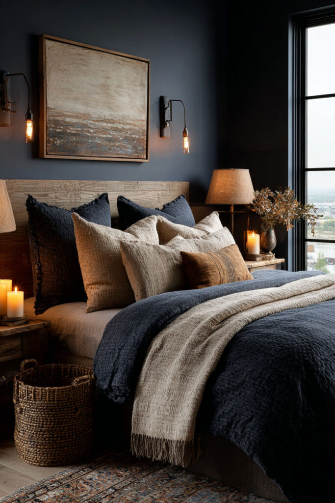 Lighting can make or break a retreat. If you’re relying on a single overhead fixture, your room is working against you. Layer it instead: a dimmable pendant or flush mount for general light, bedside table lamps with warm bulbs for reading and winding down, and maybe a small accent light — a picture light above art or a subtle LED strip behind the headboard. Against navy walls, warm lighting creates this beautiful amber glow that makes the tan tones look rich and inviting. I highly recommend installing a dimmer switch on your main light — it’s a $20 upgrade that changes the whole atmosphere. This navy blue and tan bedroom with soft lighting idea is one of the most practical on this list, and the effect is immediate. You’ll notice the difference the first night.