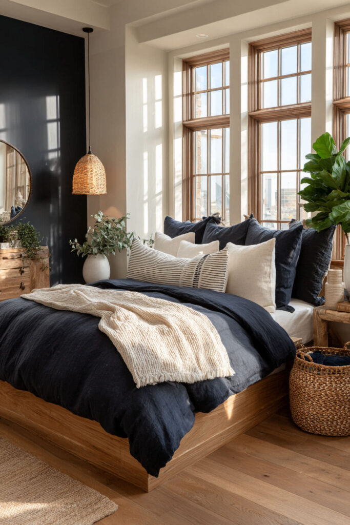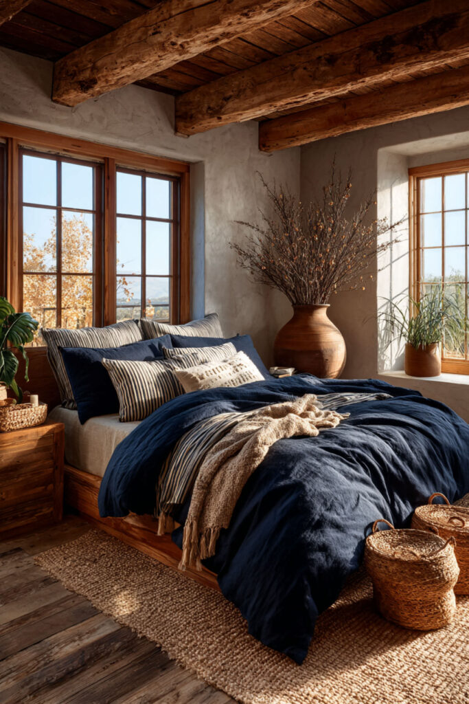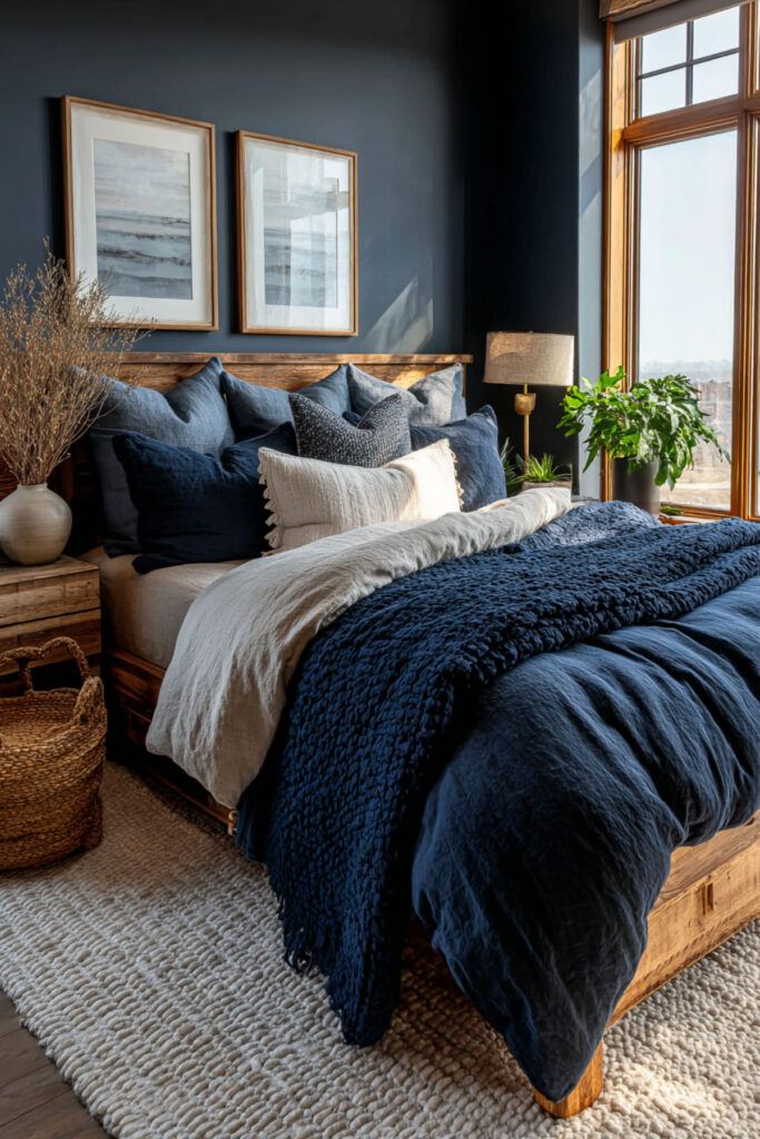 Building a reset retreat doesn’t happen overnight, and it doesn’t need to. Maybe you start with new bedding this month and paint in the spring. Maybe you swap the lamps this week and add the rug next season. The beauty of navy and tan is that every piece you add builds on the last — nothing clashes, nothing fights, everything belongs. And slowly, the room starts to feel less like a bedroom and more like the place you’ve been needing. Take a look at these Blue Earthy Bedroom Ideas for Women Who Love Organic Modern Design for a bedroom that feels natural, calming, and effortlessly modern.