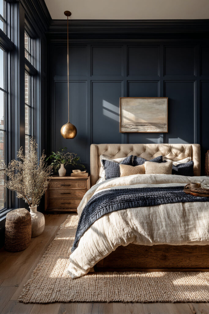 Ever since wall paneling started trending, I’ve been waiting for someone to do it in navy — and the results are extraordinary. Simple shaker-style or board-and-batten paneling painted in a rich navy, paired with tan upholstered furniture and warm cream textiles, creates a bedroom that looks like it could be featured in an interiors magazine. The paneling adds architectural interest and dimension that flat paint simply can’t match. I recommend a half-wall wainscot or full-height shaker paneling behind the bed — it’s a weekend DIY project that transforms the entire room. This timeless elegance idea is for the woman who wants her bedroom to feel permanent and considered, like a room in a house that’s been loved for decades. And the best part? Paneling covers imperfect walls, so it’s practical and gorgeous.