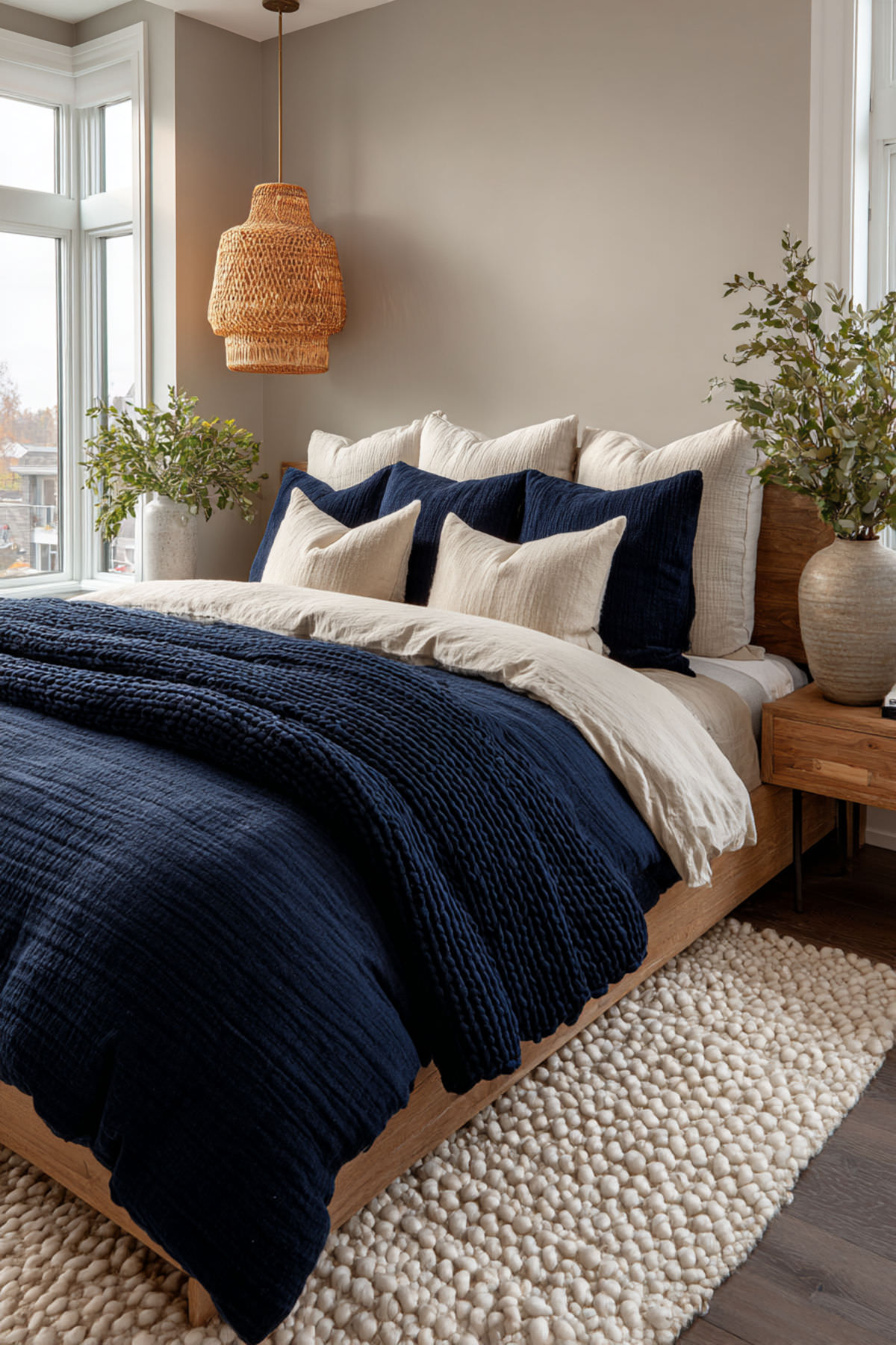 Navy Bedding with a Tan Woven Throw and Natural Textures
