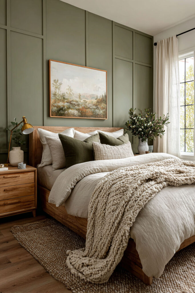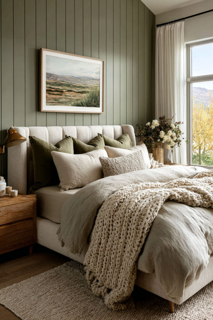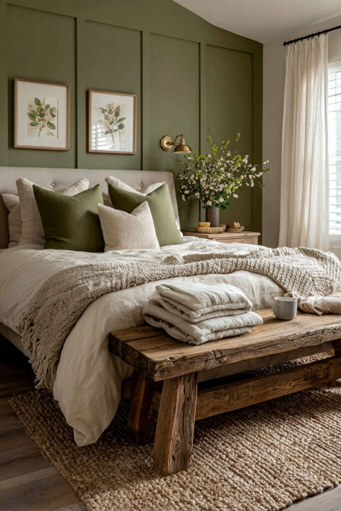 I came across this trending idea recently and I think it’s one of the most stunning ways to start a bedroom refresh. Instead of painting every wall, go with a single olive green accent wall behind your bed. It creates depth without overwhelming the space, almost like you’re sleeping in front of a soft, mossy backdrop. The trick is choosing a muted olive with warm undertones — anything too bright and it’ll feel more kitchen than calm bedroom aesthetic. I really recommend a matte-finish wall paint in a deep olive shade. Pair it with cream-colored bedding and a natural wood nightstand, and you’ve got a room that looks like it belongs in one of those restored farmhouses upstate in the Hudson Valley. The rest of the walls? Keep them in warm white or soft beige, and let that one green wall do all the talking.