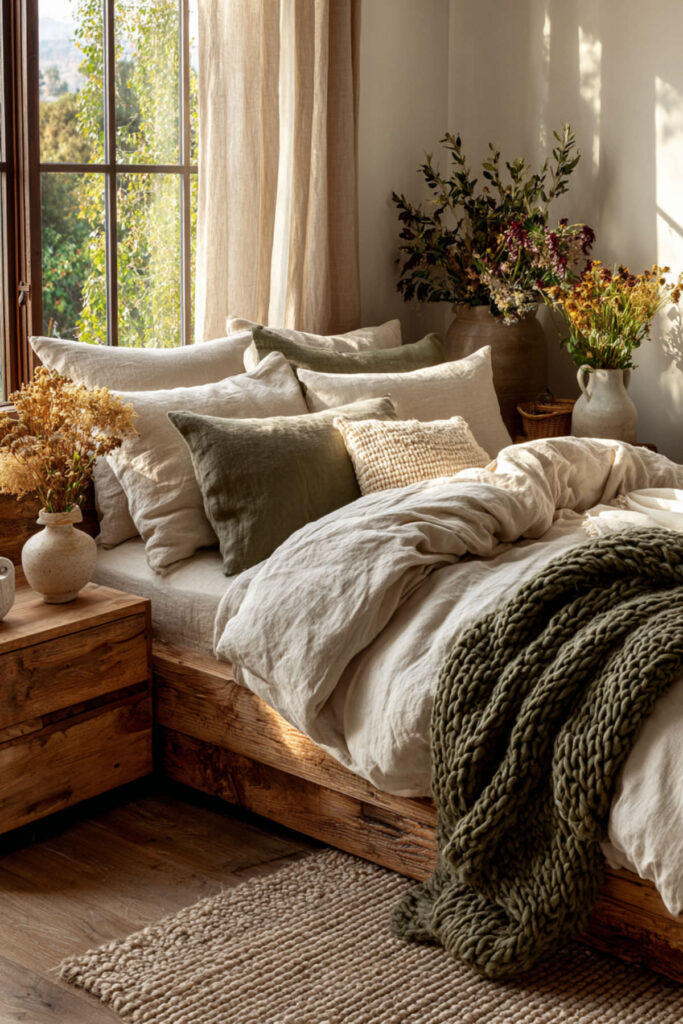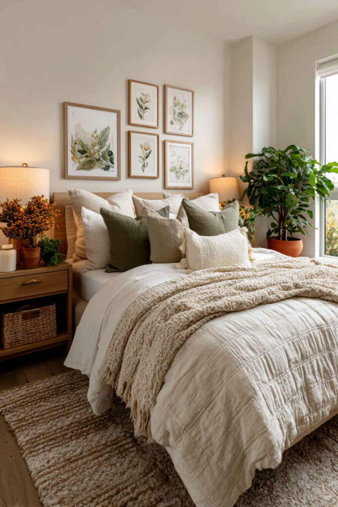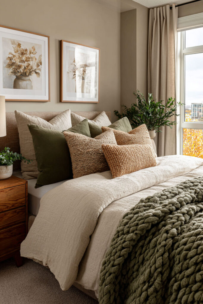 Okay, I used to think throw pillows were purely decorative fluff. I’ve totally changed my mind. The right mix of throw pillows can transform a beige bedroom into something that feels layered and rich without a single loud color in sight. Go for a combination of textures: a nubby wool pillow in olive, a smooth linen one in cream, maybe a cotton one with a subtle botanical stitch in warm taupe. I recommend a curated set of three to four earth tone throw pillows in varying textures and shades. The key is keeping them within the same warm palette but varying the feel — that’s what gives the bed dimension. It’s the difference between “nice” and “wow, who styled this?”