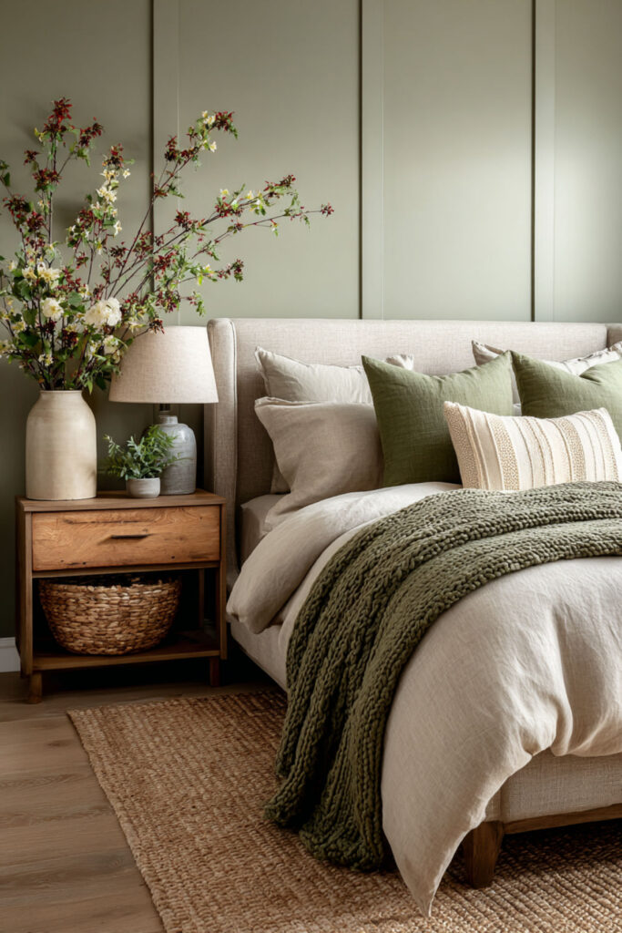 Extended headboards are still going strong, and a linen-upholstered version in warm taupe might be the most timeless choice you can make for a bedroom renovation. It anchors the room, adds softness, and pairs perfectly with olive green accents. I recommend a padded linen headboard with a gently curved top — nothing too structured. The taupe tone bridges the gap between your green and cream tones beautifully. If you want to take it further, flank it with wall-mounted sconces in a brushed brass finish for a main bedroom inspiration that feels polished but cozy. This is the kind of upgrade that makes you feel like you’re sleeping in a boutique hotel every single night.