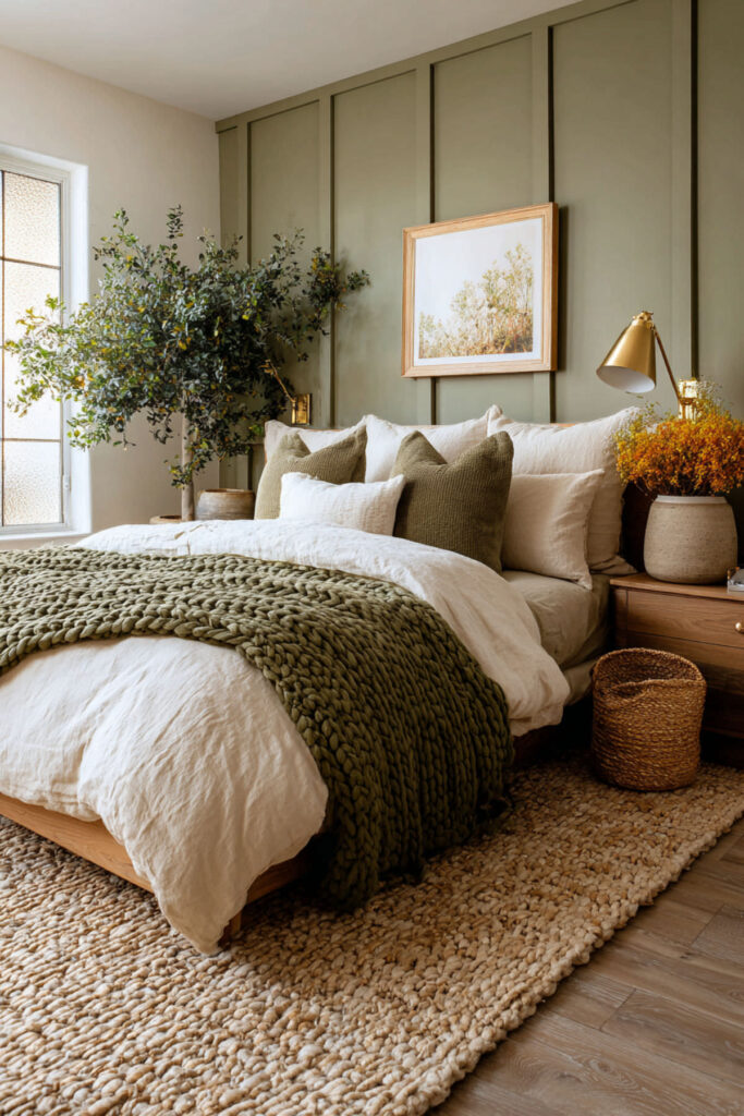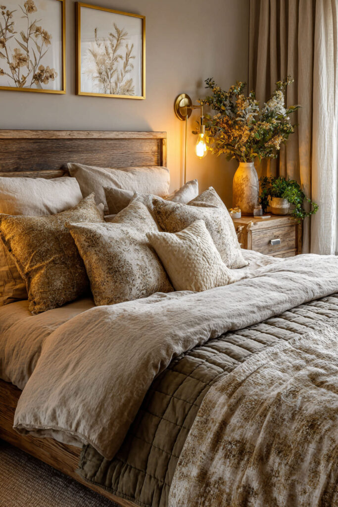 Ever since the first cool evening of fall, there’s nothing like reaching for a quilted throw that’s both beautiful and warm. An olive-and-cream quilted throw is exactly the kind of piece that pulls double duty — it looks gorgeous draped over your bed during the day, and it keeps you cozy during those cooler nights when you just want to read and unwind. I really recommend a hand-stitched cotton quilt in a two-tone olive and cream pattern. The stitching adds texture, the colors stay within that warm tones bedroom palette, and it’s the kind of thing you’ll reach for every single evening. Functional and beautiful — that’s the sweet spot.