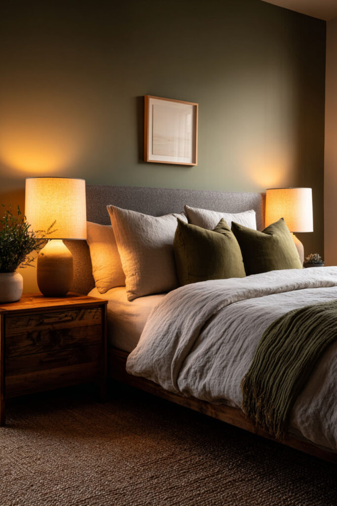 Lighting can make or break a peaceful bedroom aesthetic, and harsh overhead lights are the enemy of relaxation. Swap them for table lamps or pendant lights with linen drum shades in cream or soft tan. The linen diffuses the light so beautifully — it creates this warm glow that makes the whole room feel like golden hour. I recommend a pair of ceramic table lamps with natural linen shades for either side of the bed. The warm light (aim for 2700K bulbs) makes olive green tones look richer and more enveloping. It’s a small change that makes a massive difference, especially in the evenings when you’re winding down.
