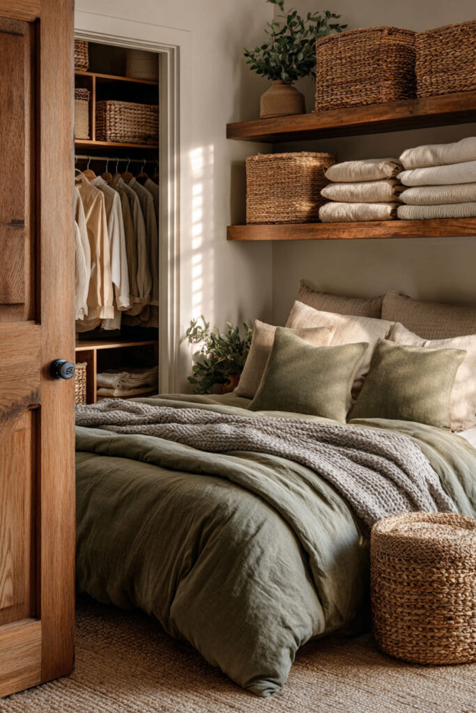 Most people forget about the closet during a bedroom refresh, but it counts. If your closet has open shelving or a visible interior, lining the back wall with a removable wallpaper in a muted olive pattern can tie everything together beautifully. Then swap out plastic bins for linen storage baskets in cream or natural. I recommend a set of fabric-lined woven storage baskets with cotton handles. They look clean, they breathe well, and they keep everything organized without that sterile feel. It’s a small touch that shows attention to the full room, not just the parts people see when the door is open.