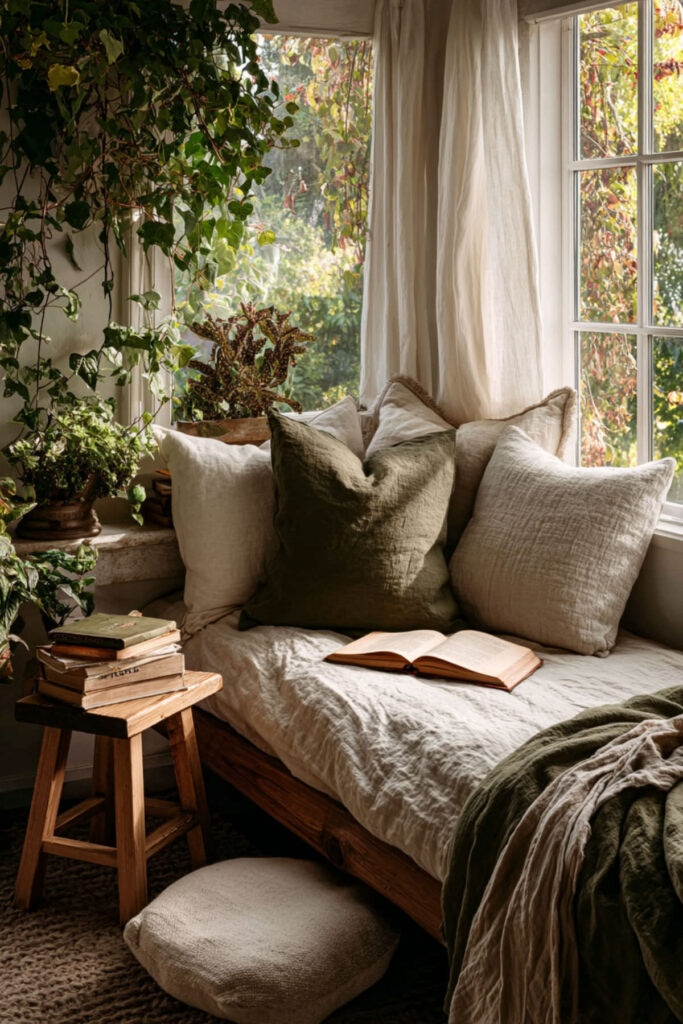 If you have even a small window seat or an unused corner, turning it into a reading nook is one of the best adult bedroom ideas for this stage of life. A bench or low chair, a thick linen seat cushion in cream, a soft olive throw blanket, and a small side table for your tea — that’s all you need. I recommend a custom-fit window seat cushion in a washed linen fabric. Add a couple of those earth tone throw pillows we talked about earlier, and you’ve got the most peaceful little spot in the house. It reminds me of those cozy window nooks you see in New England colonial homes — timeless and absolutely inviting.