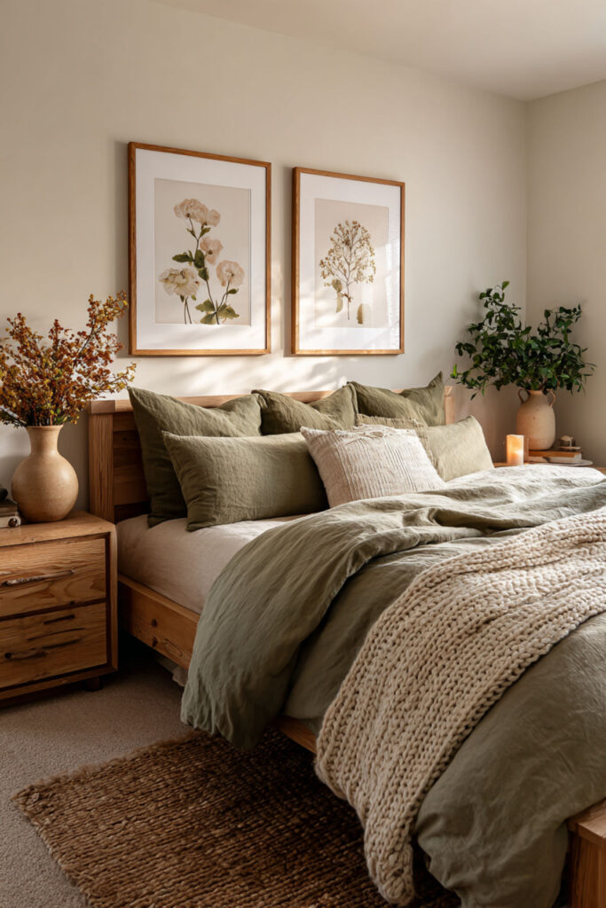 Instead of heavy framed art, try a pair of simple botanical watercolor prints on either side of the bed. Think soft ferns, olive branches, or wildflower sketches in muted greens and tans. It ties the natural color room bedrooms palette together without being too literal about the garden theme. I recommend a set of framed botanical prints with a light wood or natural frame. Keep them relatively small — 11×14 or so — to maintain that uncluttered feel. This is one of those touches that makes guests say “oh, this is lovely” without being able to pinpoint exactly why. And for women who love their gardens, it’s like bringing a quiet piece of that world inside.