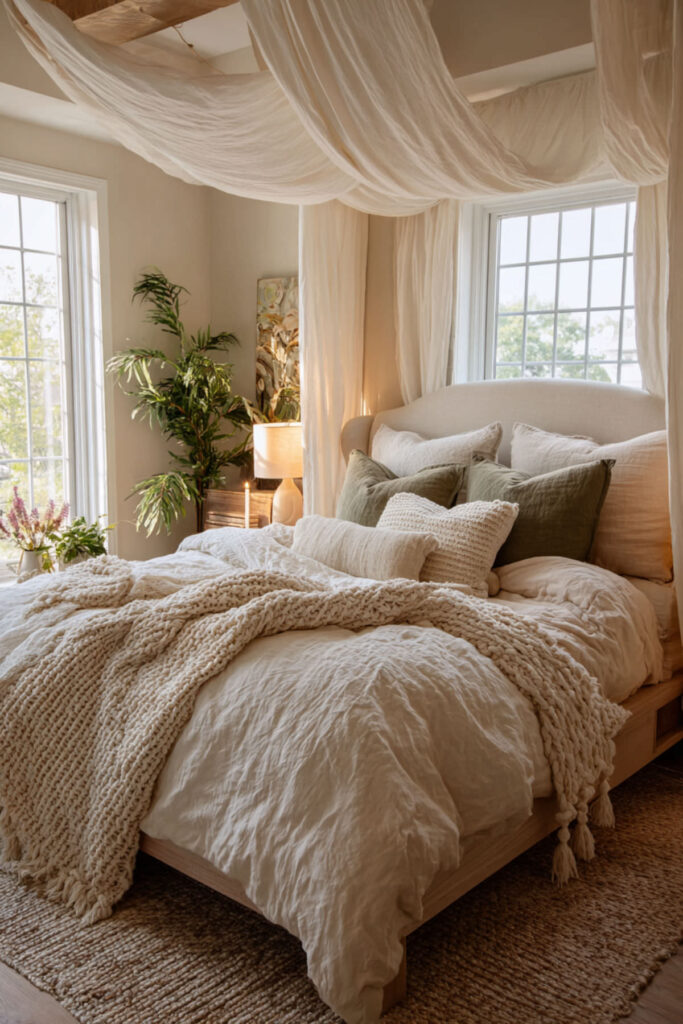 And here’s the best part — the idea I saved for last because it might just be my favorite. A simple linen bed canopy, draped loosely from a ceiling hook or a slim rod above the headboard, creates this incredibly dreamy, cocoon-like feeling. It doesn’t have to be elaborate. A single panel of sheer linen in ivory or the softest olive, falling gently on either side of the bed, changes the entire atmosphere. I highly recommend a lightweight sheer linen canopy panel with a natural drape. It softens the room, adds a layer of warmth, and makes the bed feel like the centerpiece it deserves to be. This is the kind of thing that turns regular master bedrooms decor into something truly special — a personal sanctuary that reflects everything you love about nature and quiet living.