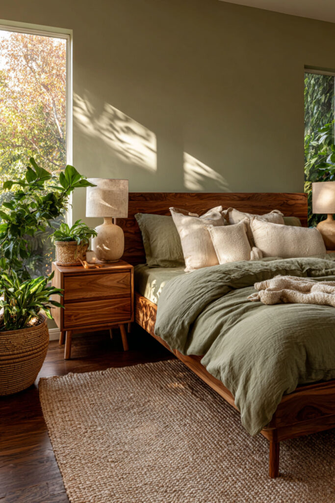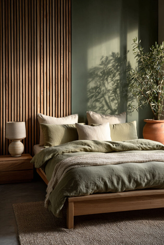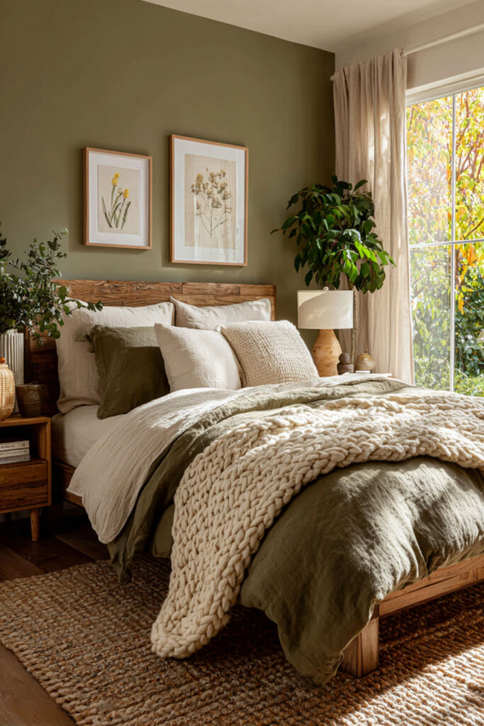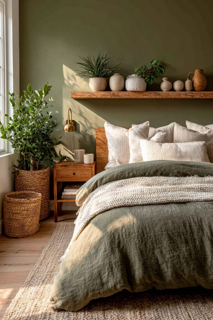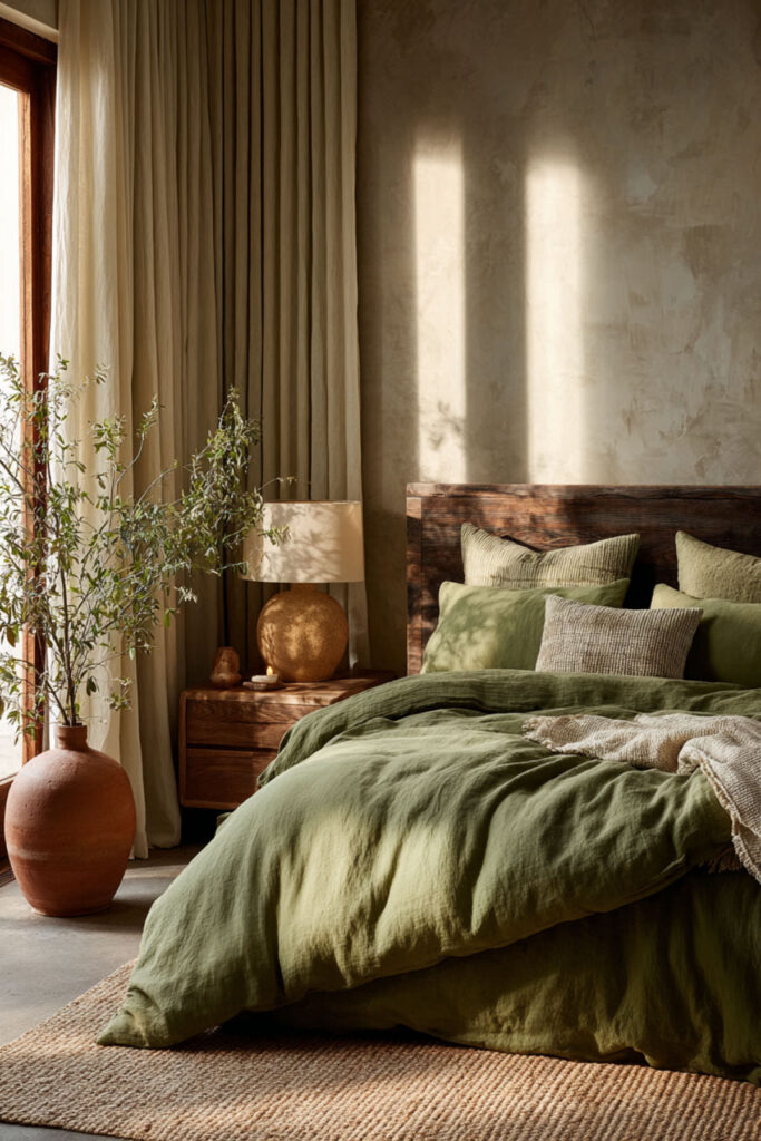 Olive green on all four walls creates a room that feels like being inside a forest canopy at dusk — warm, enclosed, alive. Unlike brighter greens that energize, olive absorbs light and calms the space, creating the muted, grounded atmosphere that an organic sanctuary needs. The color shifts beautifully with natural light (reading greener in daylight, warmer and browner under lamplight), which means the room changes organically throughout the day without you touching anything. Matte finish deepens the effect and keeps the walls from reflecting light. I recommend olive green interior wall paint in matte finish on all four walls. Choose a shade with warm undertones — olive should feel like it has brown and gold inside it, not grey. This olive green bedroom and olive green bedroom ideas foundation builds the room’s entire atmosphere from the walls inward — the living color that holds everything else.