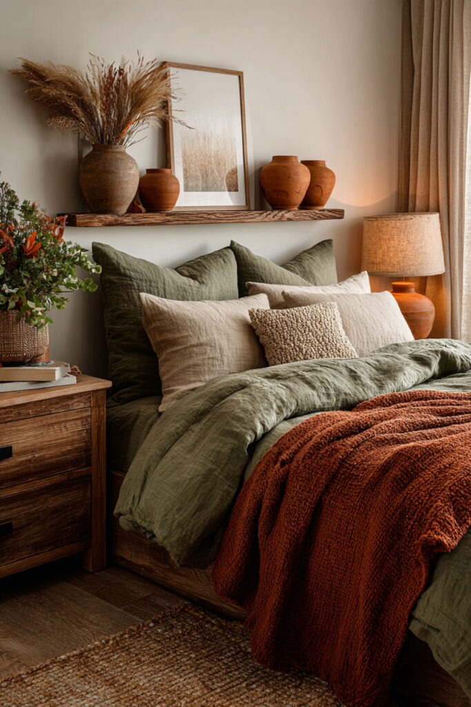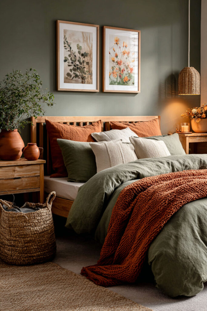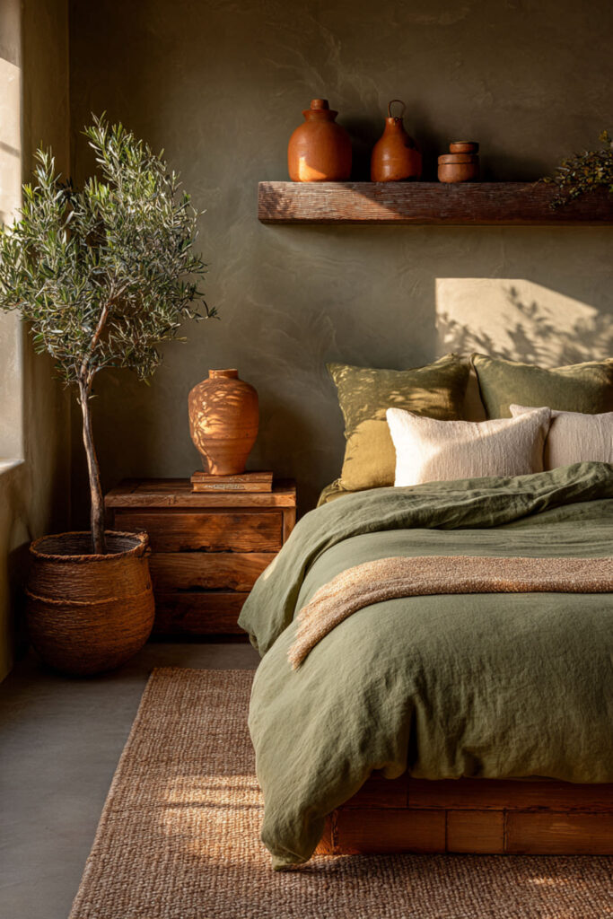 Terracotta against olive green creates the palette that references the natural world most directly — green foliage against reddish earth, the combination you see in Mediterranean landscapes, desert gardens, and autumn fields. The warmth of terracotta (its reddish-brown glow) activates the olive green’s depth, pulling out its warm undertones and creating a dialogue between two earth tones that feels ancient and instinctive. I recommend terracotta accents in three to five places: throw pillows, a ceramic pot or vase, a piece of art, and one textile (a throw blanket or area rug border). Keep the terracotta muted rather than bright — dusty, clay-toned, not orange. This green and terracotta bedroom and terracotta and green bedroom idea introduces the second earth tone that transforms olive green from a color choice into a landscape — the warmth that makes the green room feel like a place.