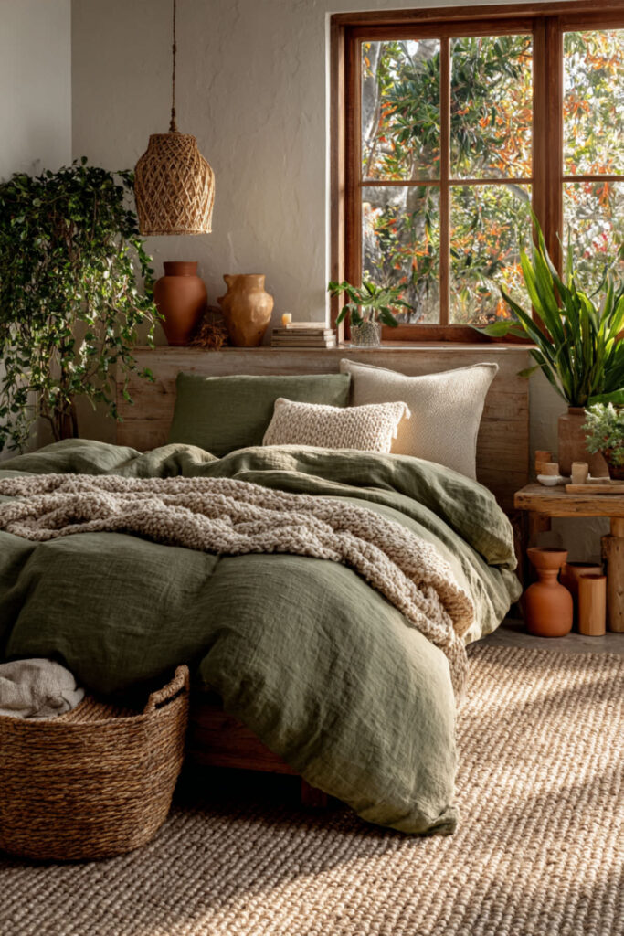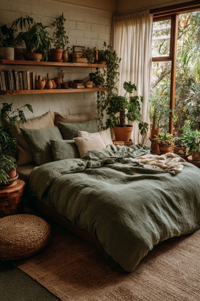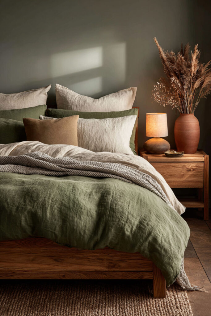 Linen is the textile of an organic sanctuary — it’s made from flax (a plant), it breathes and regulates temperature naturally, it gets softer with every wash without losing its structure, and its slightly rumpled texture looks beautiful without being perfectly made. Natural-toned linen (undyed flax, oat, cream) against olive green walls adds the organic layer that connects the walls to the bed through material rather than just color. The linen’s texture creates visual warmth and a lived-in quality that crisp cotton can’t replicate. I recommend 100% linen sheets and duvet cover in natural, oat, or cream. Don’t iron them — the organic texture is the point. This green bedroom aesthetic and green earthy bedroom idea adds the one textile that makes the bed feel genuinely connected to the natural palette — fabric that came from the earth, for a room inspired by it.