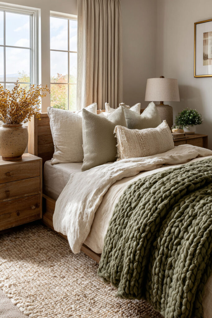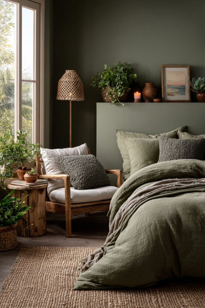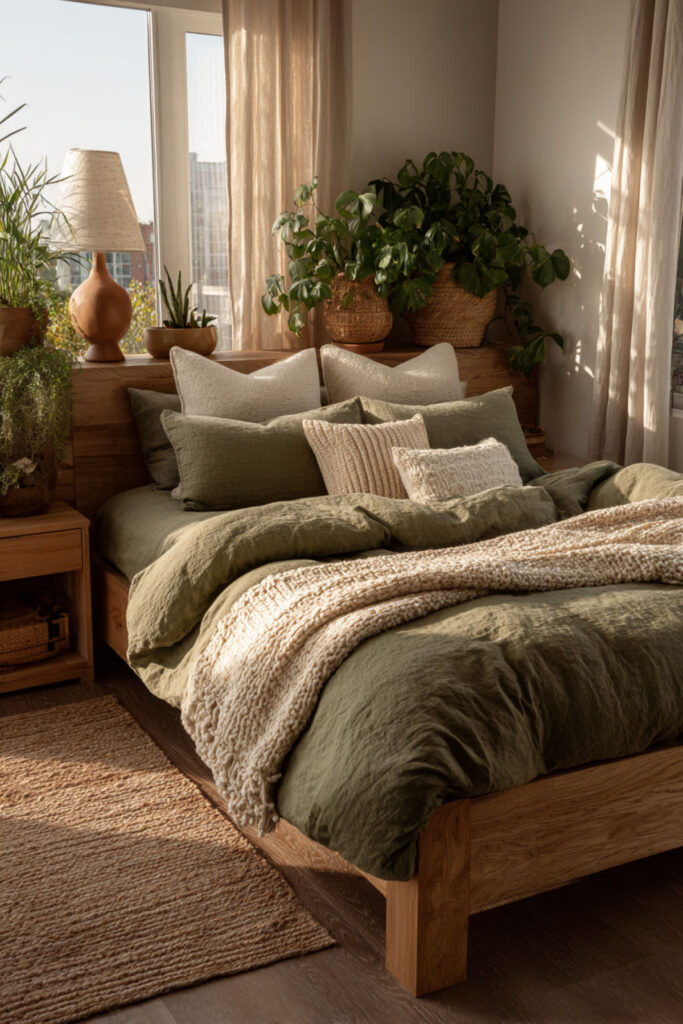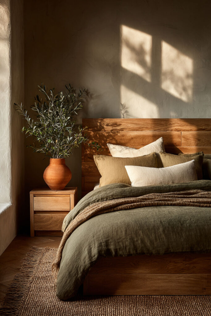 This final idea is about what the room means once it’s built. An organic sanctuary isn’t a Pinterest board you execute once and forget. It’s a practice — a daily relationship with a space that supports your restoration. The candle gets lit. The surfaces stay clear. The bed gets made with care (or with the beautiful carelessness that linen allows). The plants get watered. The room gets your attention because the room gives you its attention back: the olive green that soothes without stimulating, the terracotta that warms without demanding, the linen that softens with every wash, the wood that ages into something more beautiful. I recommend treating this room as a practice, not a project. The sanctuary isn’t finished when the last pillow is placed. It’s maintained every evening, honored every morning, and returned to every time the world outside asks more than you have. This olive green bedroom ideas and green earthy bedroom idea is the most important because it names the truth: the organic sanctuary works because you return to it, and it returns the favor.