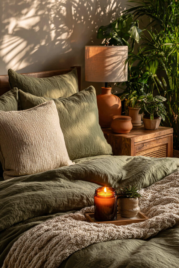 Scent completes the organic sanctuary by extending the nature reference from visual and tactile into olfactory. Eucalyptus, fig, cedarwood, and vetiver are the fragrance families that match olive green and terracotta — green, woody, earthy, and grounding. Activated in the evening, the scent becomes the room’s invisible atmosphere, a neurological cue that this space means rest and restoration. Over time, the scent-rest association strengthens, and lighting the candle begins triggering the relaxation response before you’re even in bed. I recommend one high-quality scented candle in eucalyptus, fig, cedarwood, or vetiver, in a ceramic, terracotta, or amber glass vessel, placed on the dresser or nightstand and lit 20 to 30 minutes before bed. This green bedroom decor and sage green bedroom idea adds the sensory layer that makes the sanctuary three-dimensional — the invisible forest that enters the room before you close your eyes.