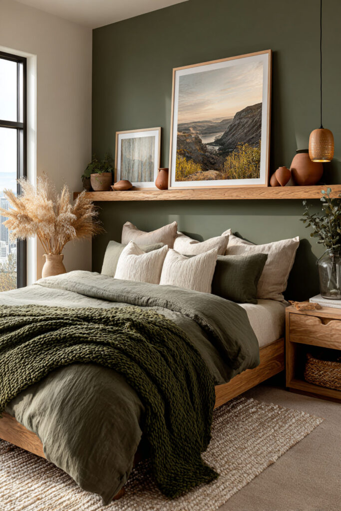 An Olive Green Accent Wall Behind the Bed: Grounded Focus