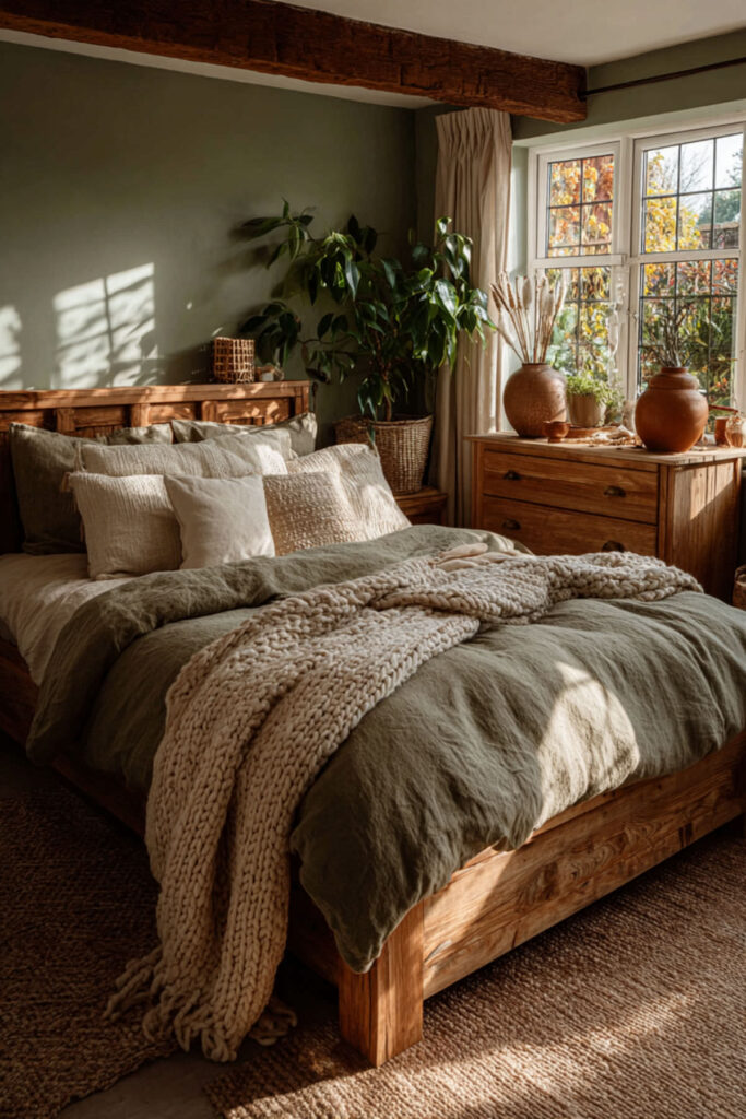 Olive green walls with warm beige bedding, beige curtains, and beige textiles create the softest, most enveloping version of the organic palette. Beige carries more warmth and earthiness than cream, so the room feels like a warm nest rather than a bright space with green walls. This combination is especially effective for women who want the grounding quality of olive green but prefer their bedroom to feel wrapped and held rather than open. I recommend olive green walls with warm beige duvet cover, beige or sand-toned curtains, and warm beige textiles. Bridge with natural wood furniture and terracotta accents. This olive green and beige bedroom and green and beige bedroom idea creates the version that feels like being held by the earth — maximum warmth, maximum organic softness, the sanctuary at its most nurturing.