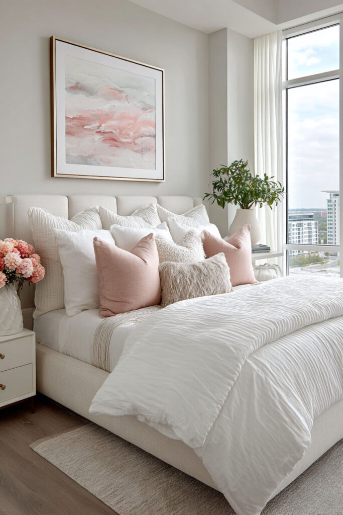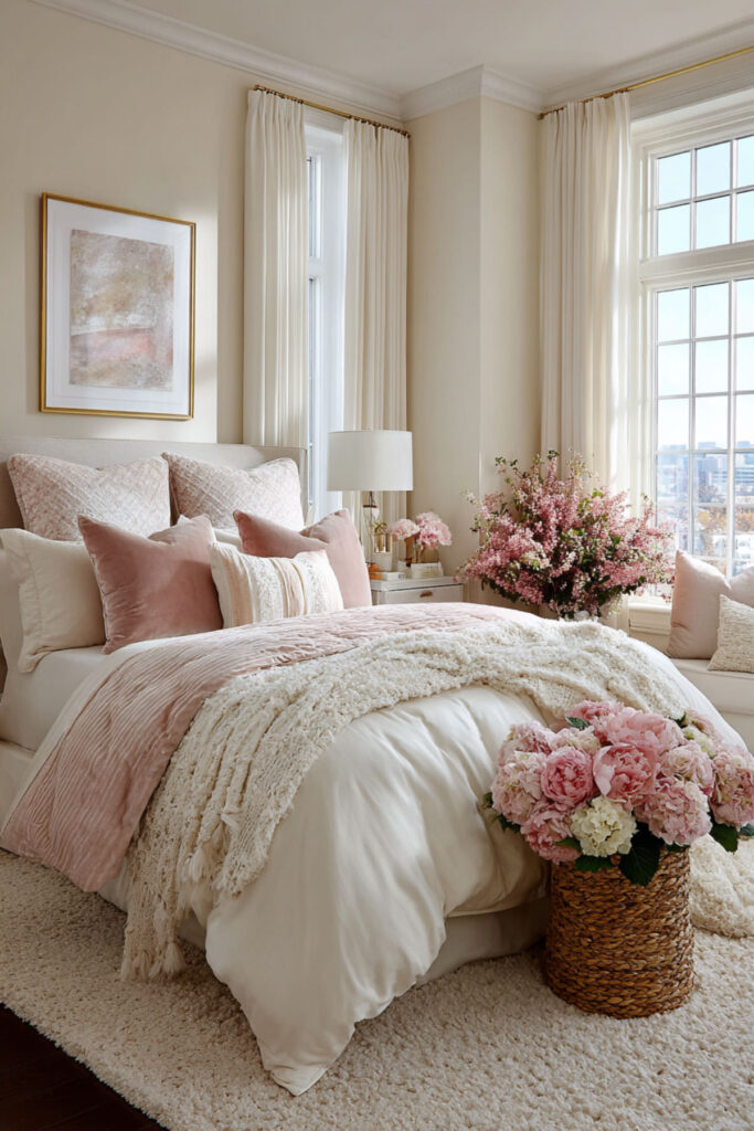 Let’s start with the combo that’s basically the yoga pants of bedroom colors—comfortable, flattering, and goes with everything. Pale blush pink walls paired with cream accents create this envelope of warmth that feels like being hugged by a cloud. The trick is choosing a blush with peachy undertones rather than cool pink—think “inside of a seashell” not “Barbie’s guest room.”