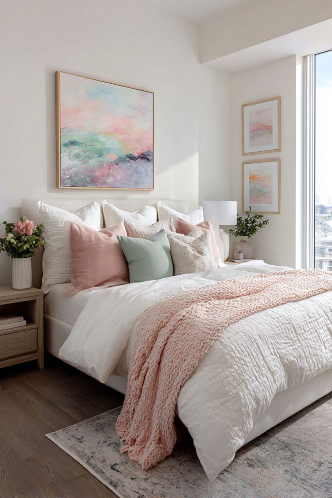 What if you’re renting or just can’t commit to colored walls? Create your pastel paradise through decor instead. Keep everything white—walls, furniture, bedding—then layer in pastel artwork, pillows, and accessories.