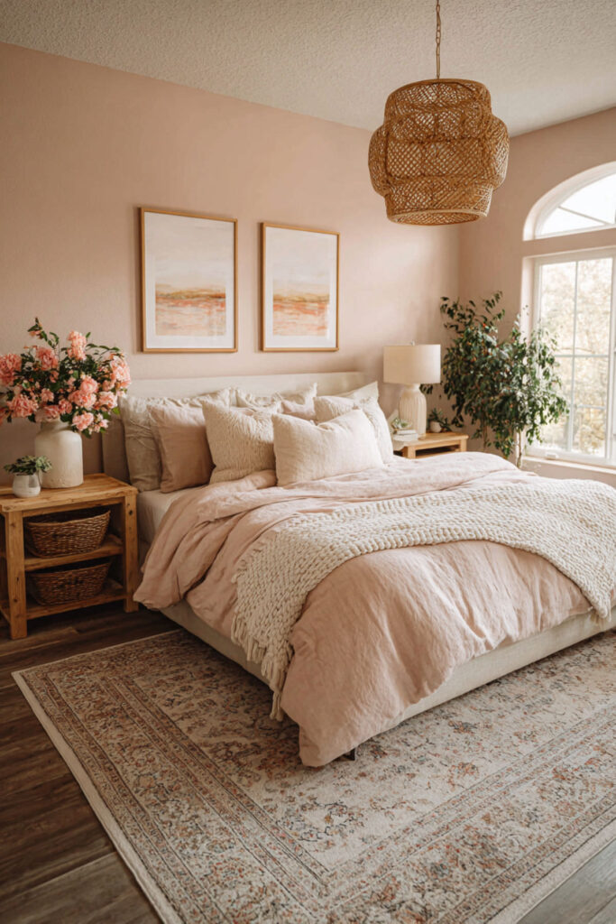 I really recommend this type of cream linen curtain set… they soften the light beautifully while complementing those blush walls. Ever since millennial pink had its moment, people think pink bedrooms are overdone, but this whisper-soft approach feels completely different—more grown-up sanctuary, less Instagram backdrop.
