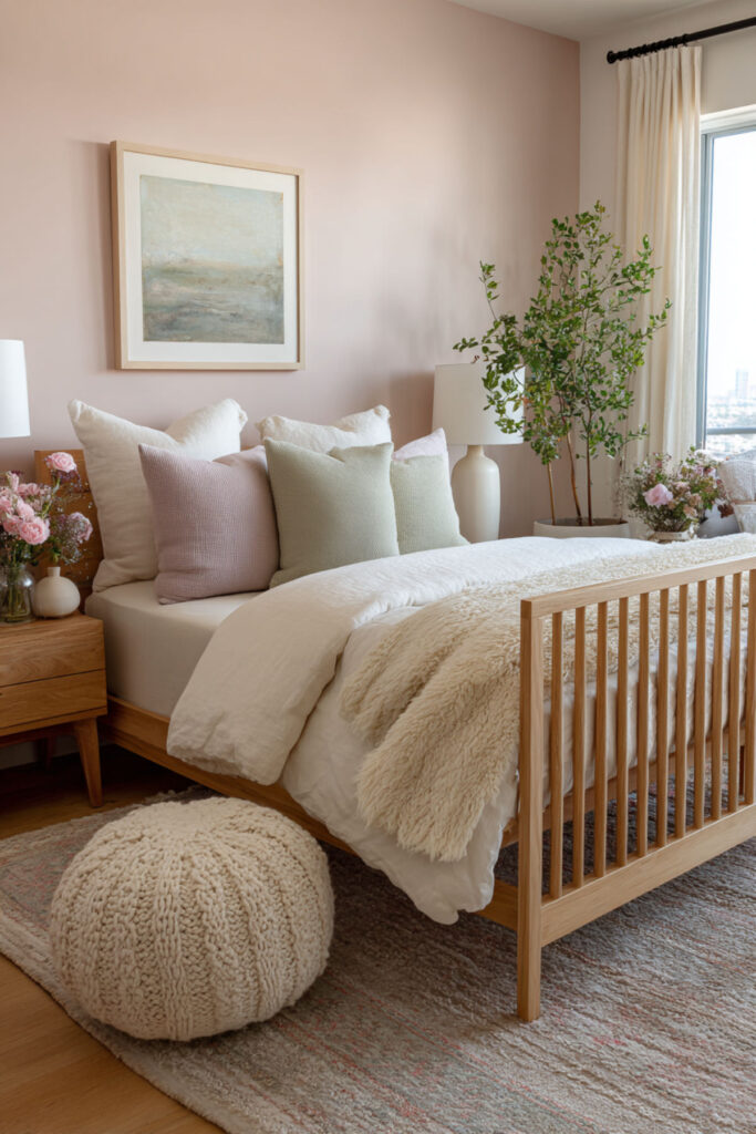 Sometimes the smartest move is keeping walls white and bringing in pastels through everything else. This approach gives you maximum flexibility (crucial when pregnancy brain makes decisions feel impossible). Layer in pale lavender bedding, mint green throw pillows, maybe a barely-pink area rug.