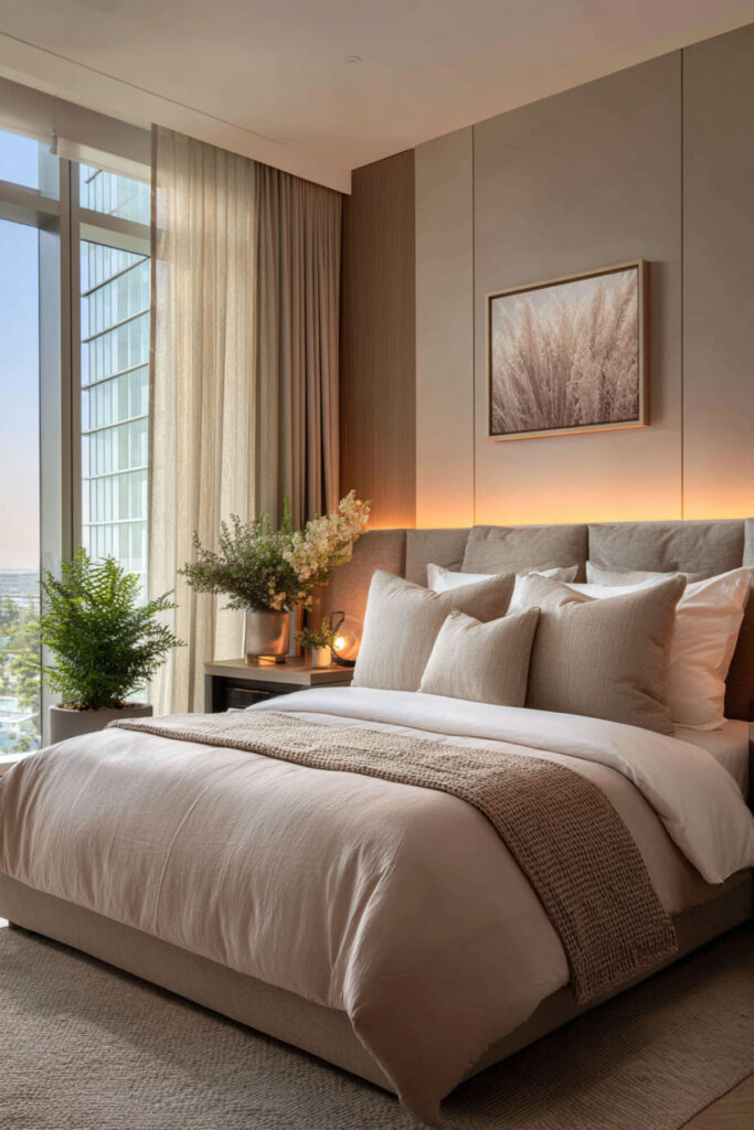 Since actual sleep is rare, your bedroom needs to promote relaxation even when you’re awake. Soft pink lighting, whether through lampshades or smart bulbs, creates an ambiance that soothes.