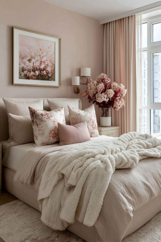 Add a plush area rug in powder pink or rose – something that feels as soft as it looks. This grounding element adds comfort while maintaining your color scheme.