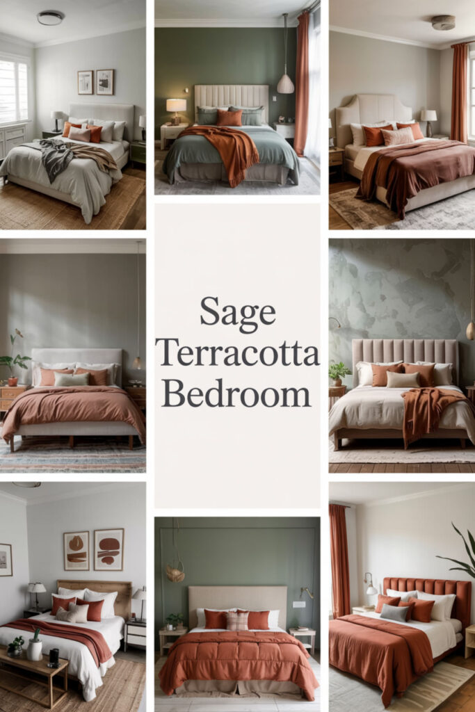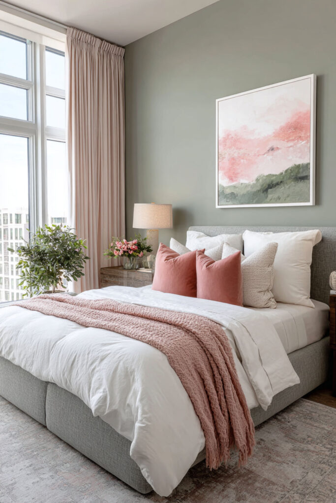 This trending combination brings serious cozy vibes to bedtime. Terracotta accents against sage walls create an earthy palette that’s both grounding and interesting. Think rust-colored throw pillows, maybe a terracotta planter for a low-maintenance plant.