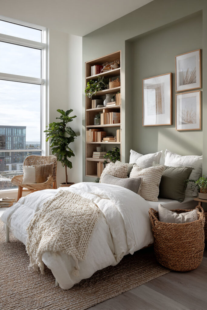 If you’re not ready to commit to full sage rooms, let’s talk accent walls. One sage green wall behind the bed creates a calming focal point without overwhelming the space. This approach works especially well in small bedrooms where too much color might feel claustrophobic.