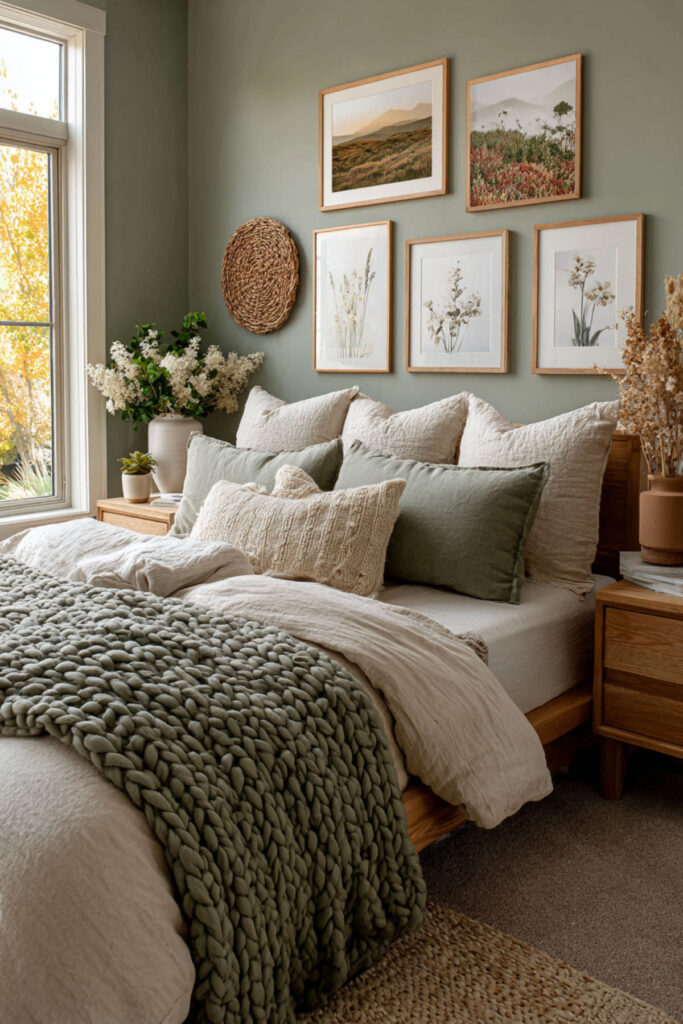 The walls are where you can really reinforce that calming vibe. Skip the busy gallery walls and opt for simple, nature-inspired sage green art. I highly suggest this type of minimalist forest print set… they complement sage walls without adding visual chaos.