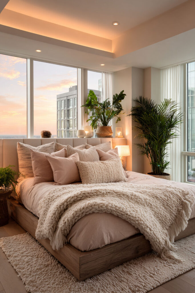Milk bath nails – those creamy, semi-sheer neutrals – inspire the coziest bedroom palette. Think layers of cream, blush, and beige that blend seamlessly. I really recommend starting with a soft velvet bedding set in these tones and adding texture through knits, velvet, and brushed cotton.